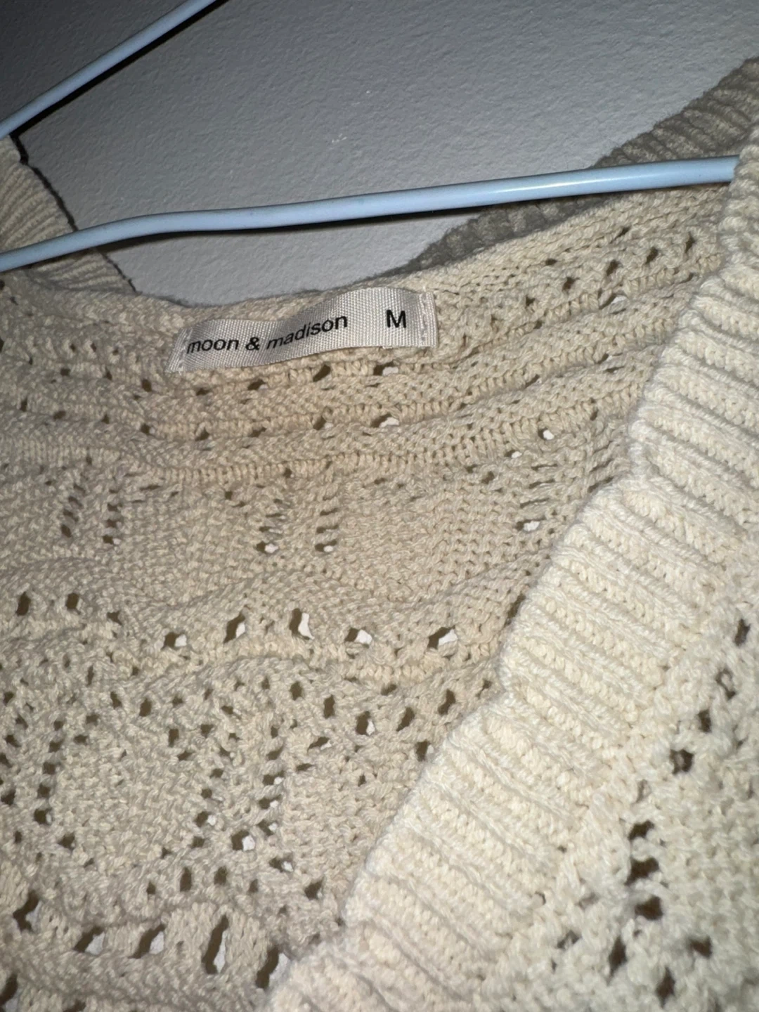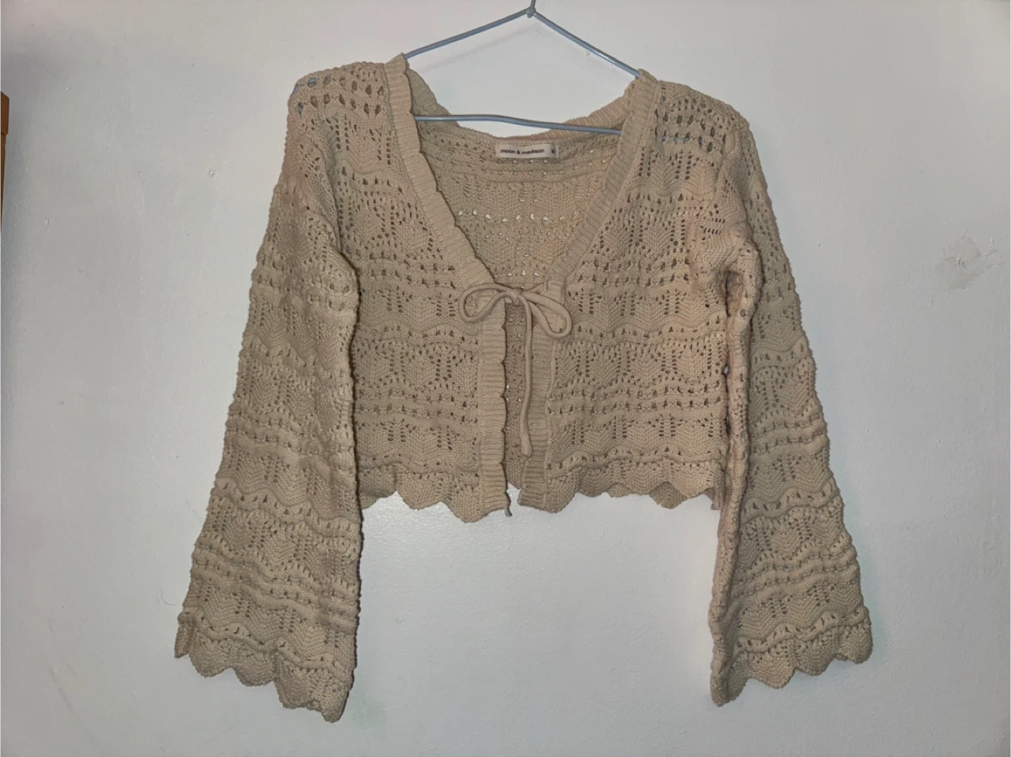 Moon & Madison cropped cardigan sweater. Beige crochet knit with a tie closure. Size medium.
