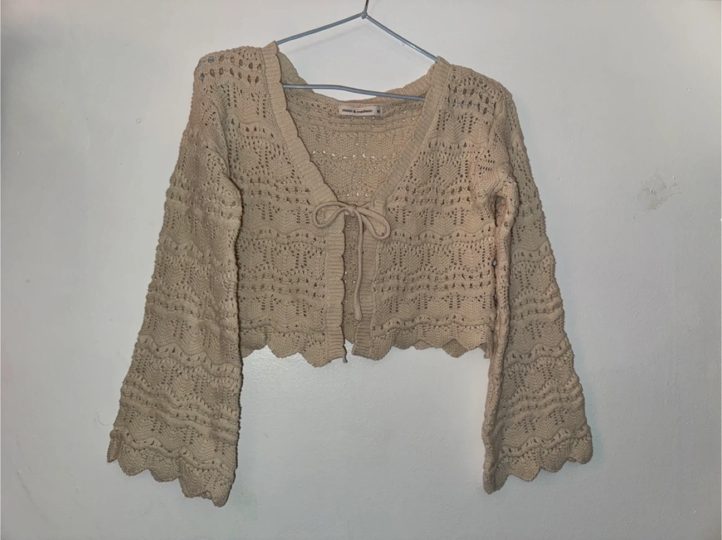 Moon & Madison cropped cardigan sweater. Beige crochet knit with a tie closure. Size medium.