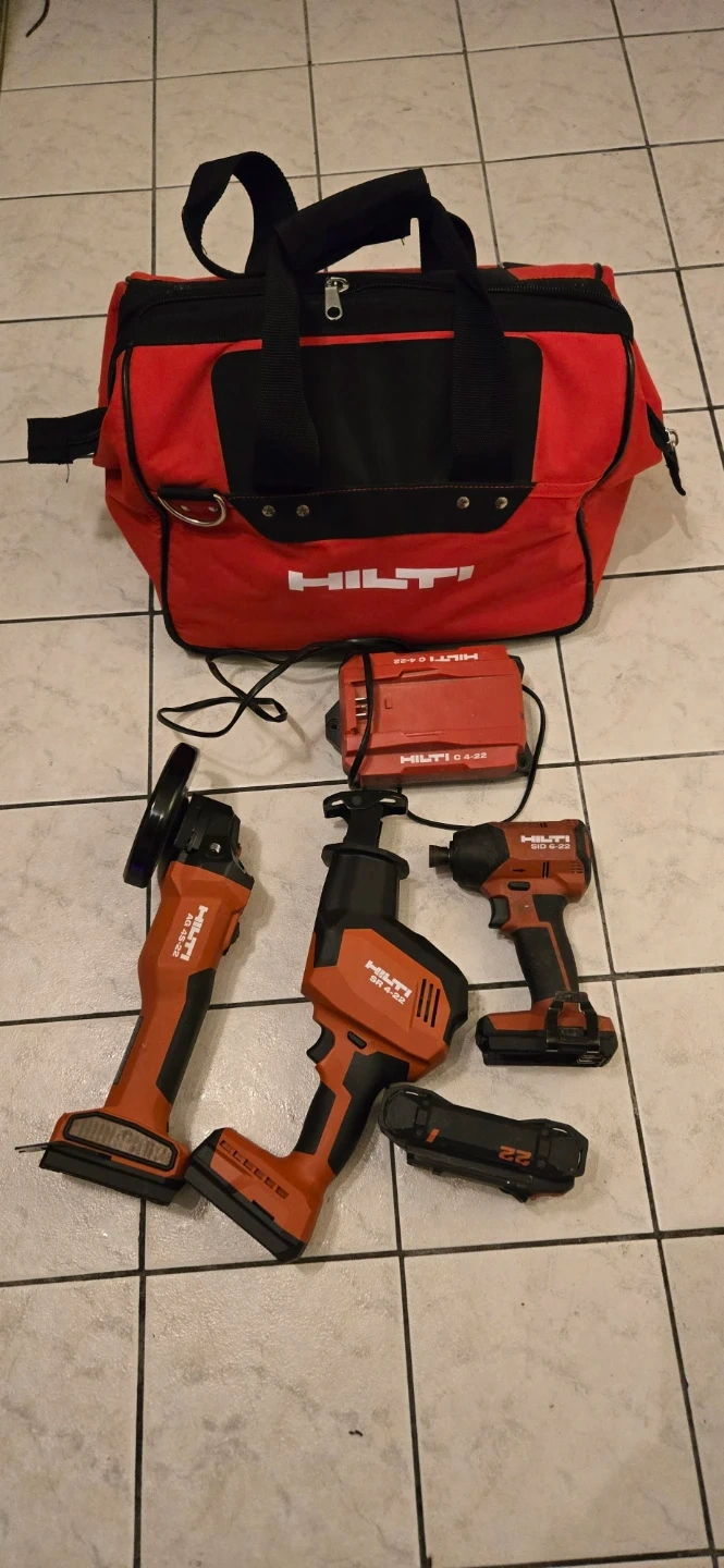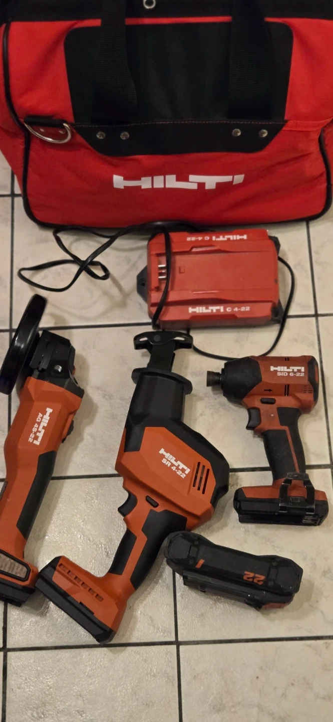 Includes Hilti cordless angle grinder, reciprocating saw, and impact driver. Comes with two batteries, charger, and carrying bag. Tools are orange and black.
