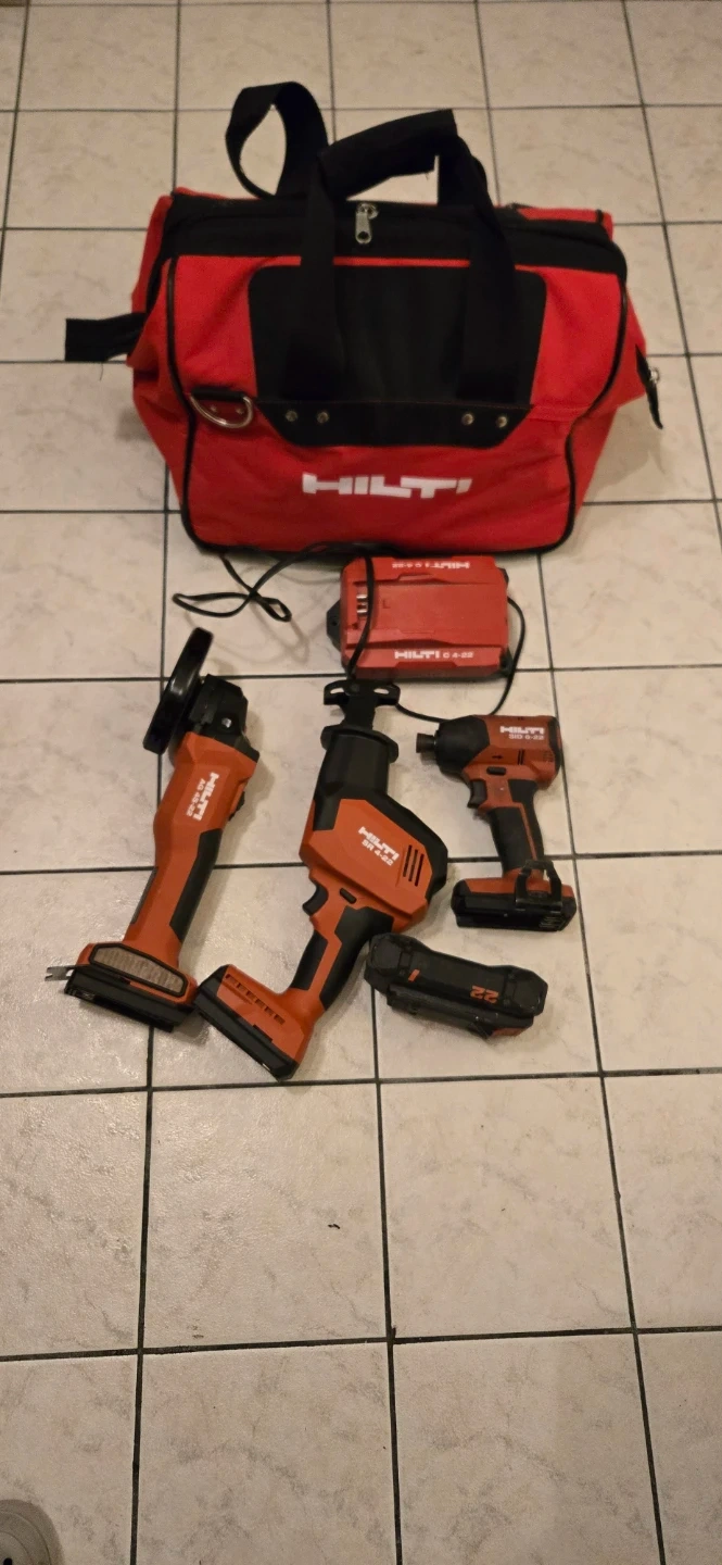 Includes Hilti cordless angle grinder, reciprocating saw, and impact driver. Comes with two batteries, charger, and carrying bag. Tools are orange and black.