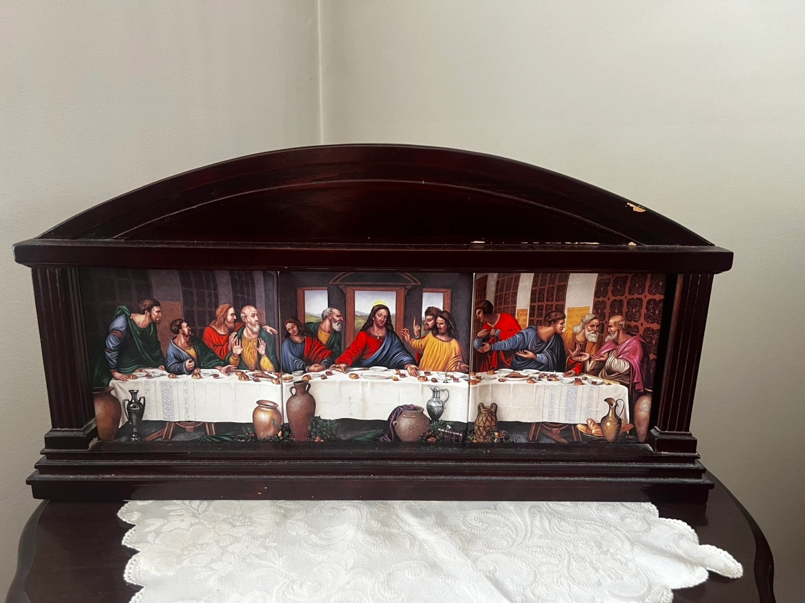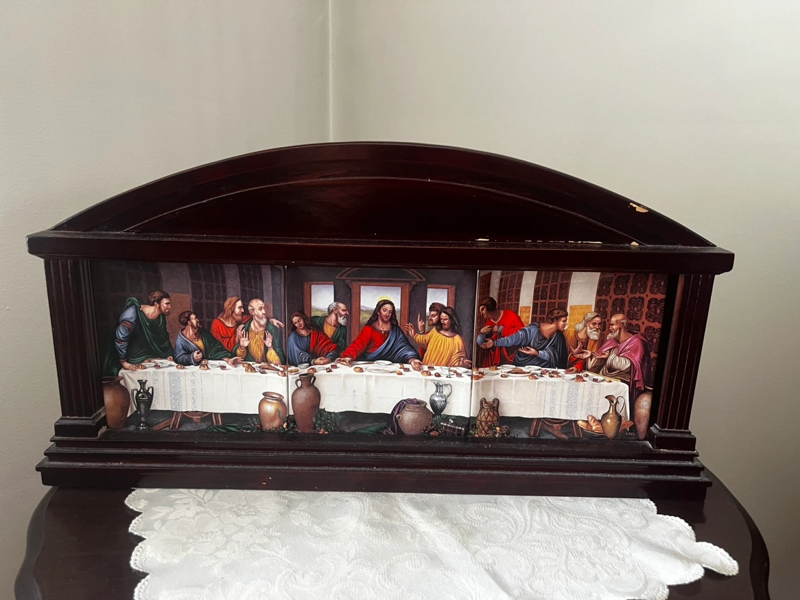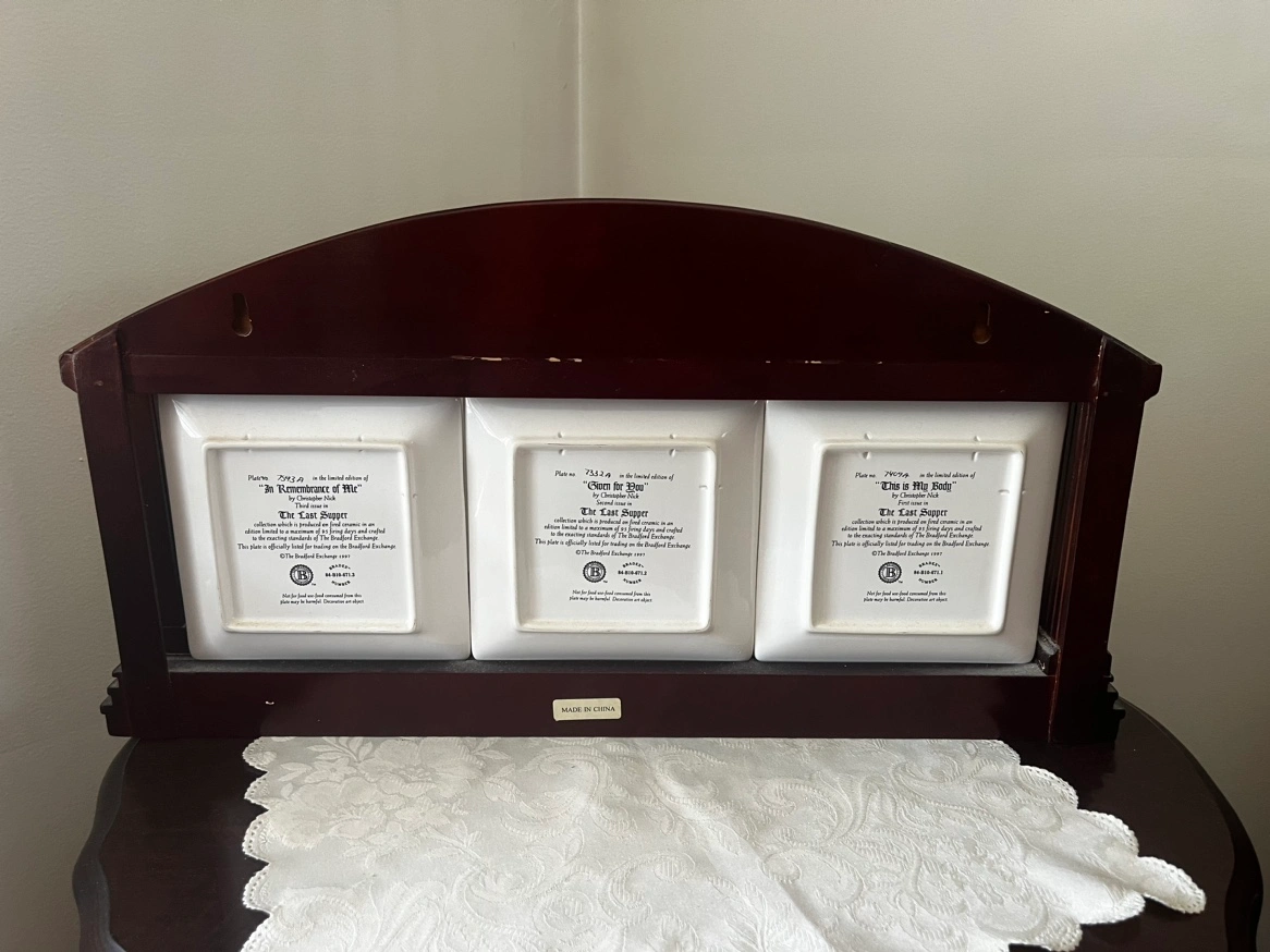 Lightly used set of 3 Bradford exchange plates of the last supper. Comes with the display rack (which has a small amount of damage on the top of it). The plates are the following This is my Body, Given to you, and in Remembrance of me.