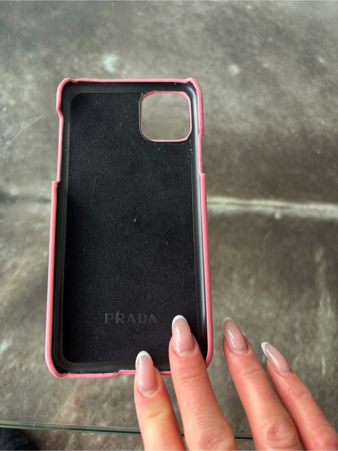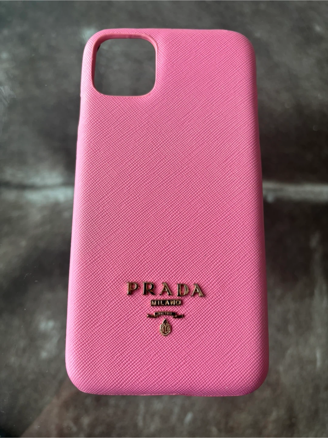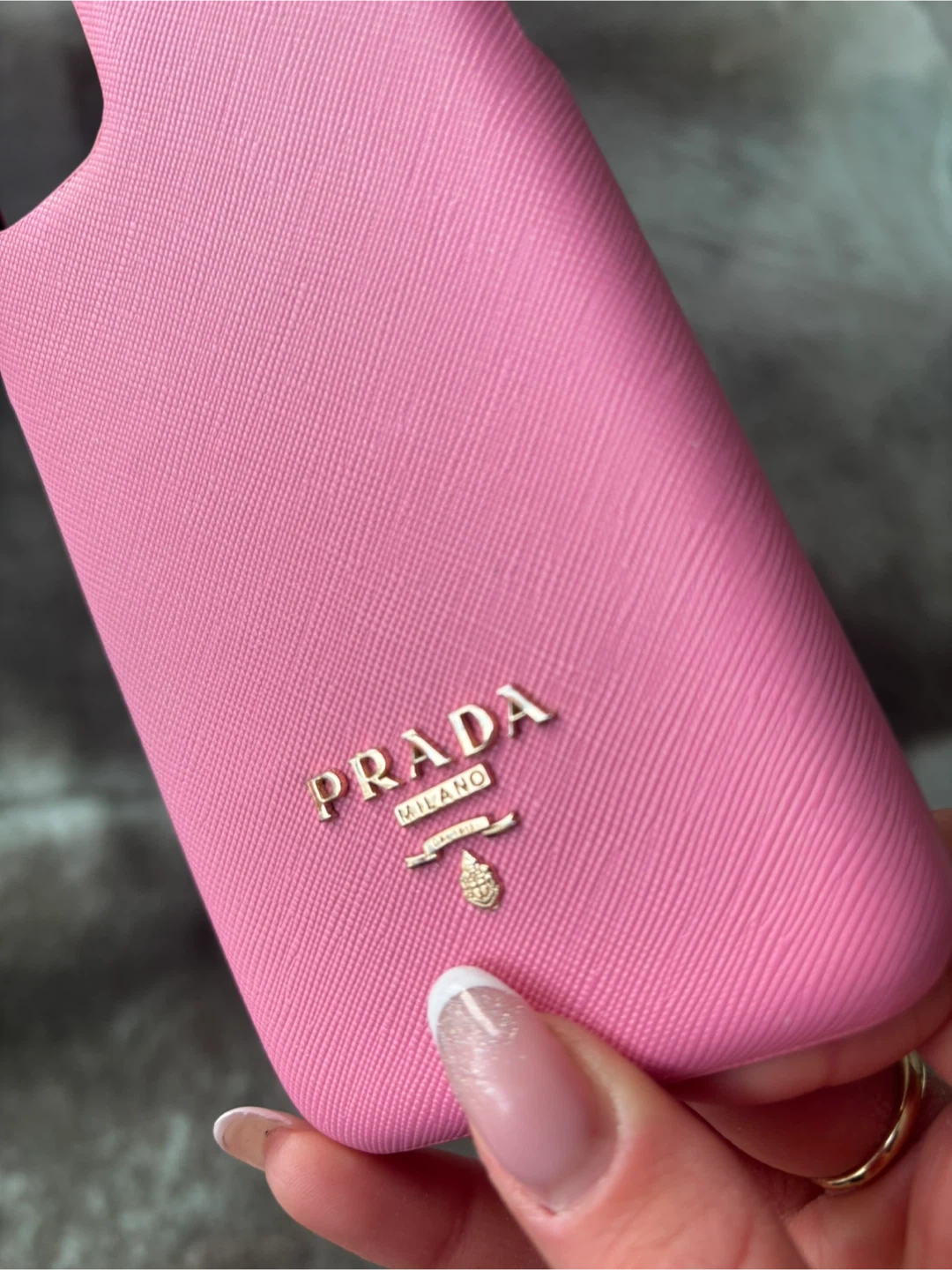 This is a Prada phone case made from pink Saffiano leather. It has a soft inner lining for protection. It's a stylish accessory for your phone.