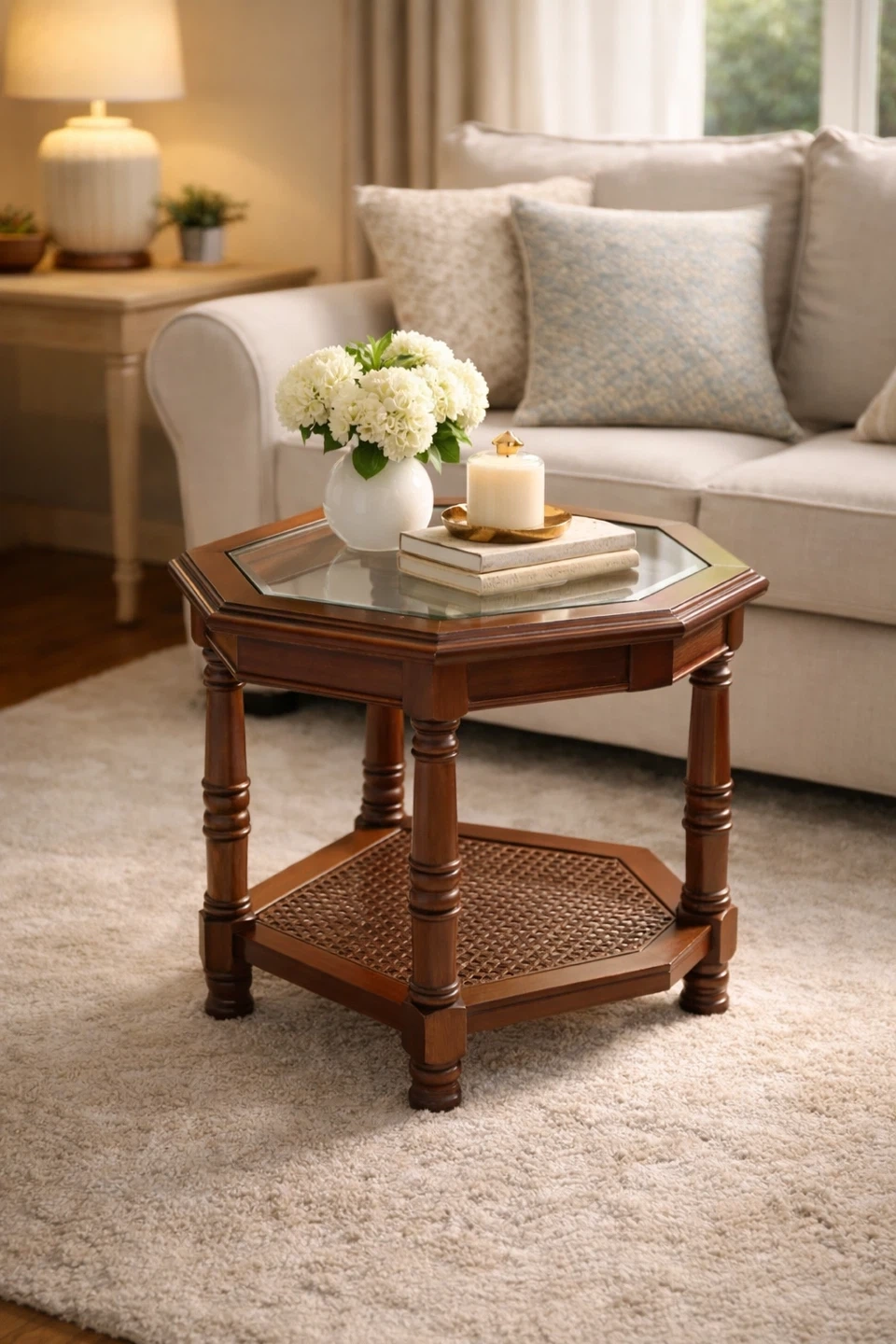 Selling a lovely wooden octagon-shaped end table! It features a glass top and a woven shelf underneath. Perfect for adding a touch of elegance to any living space