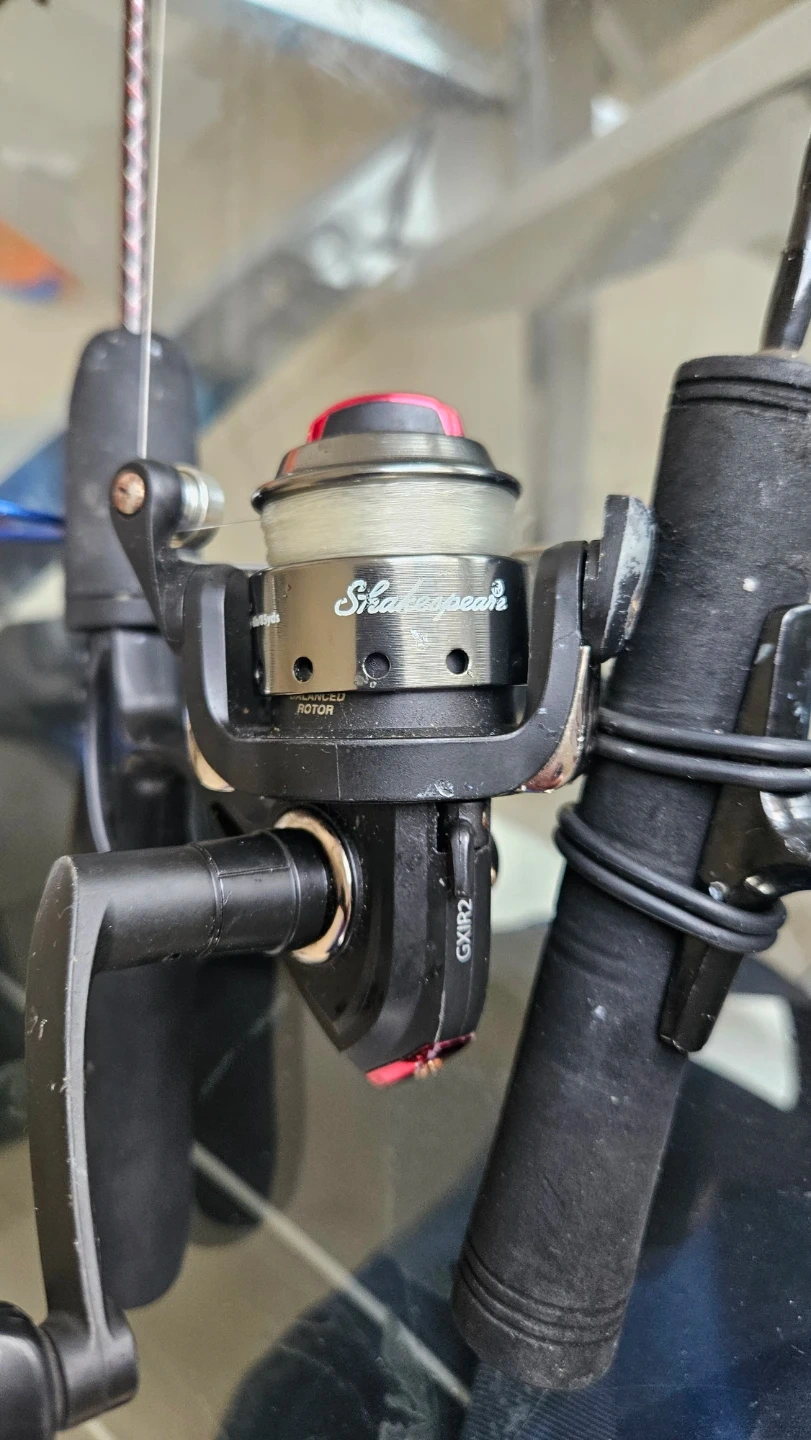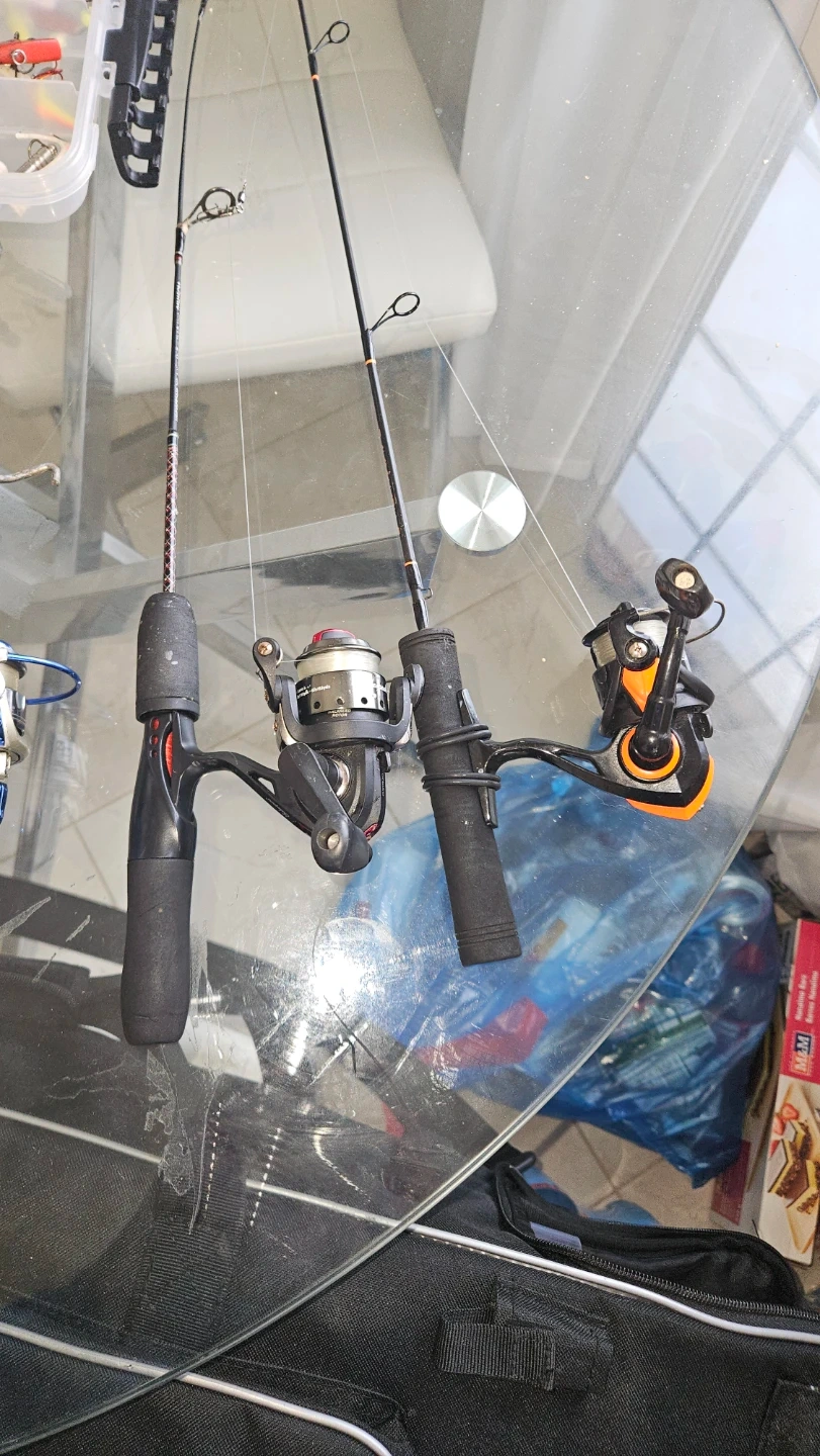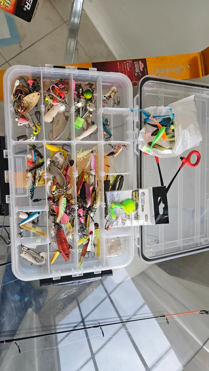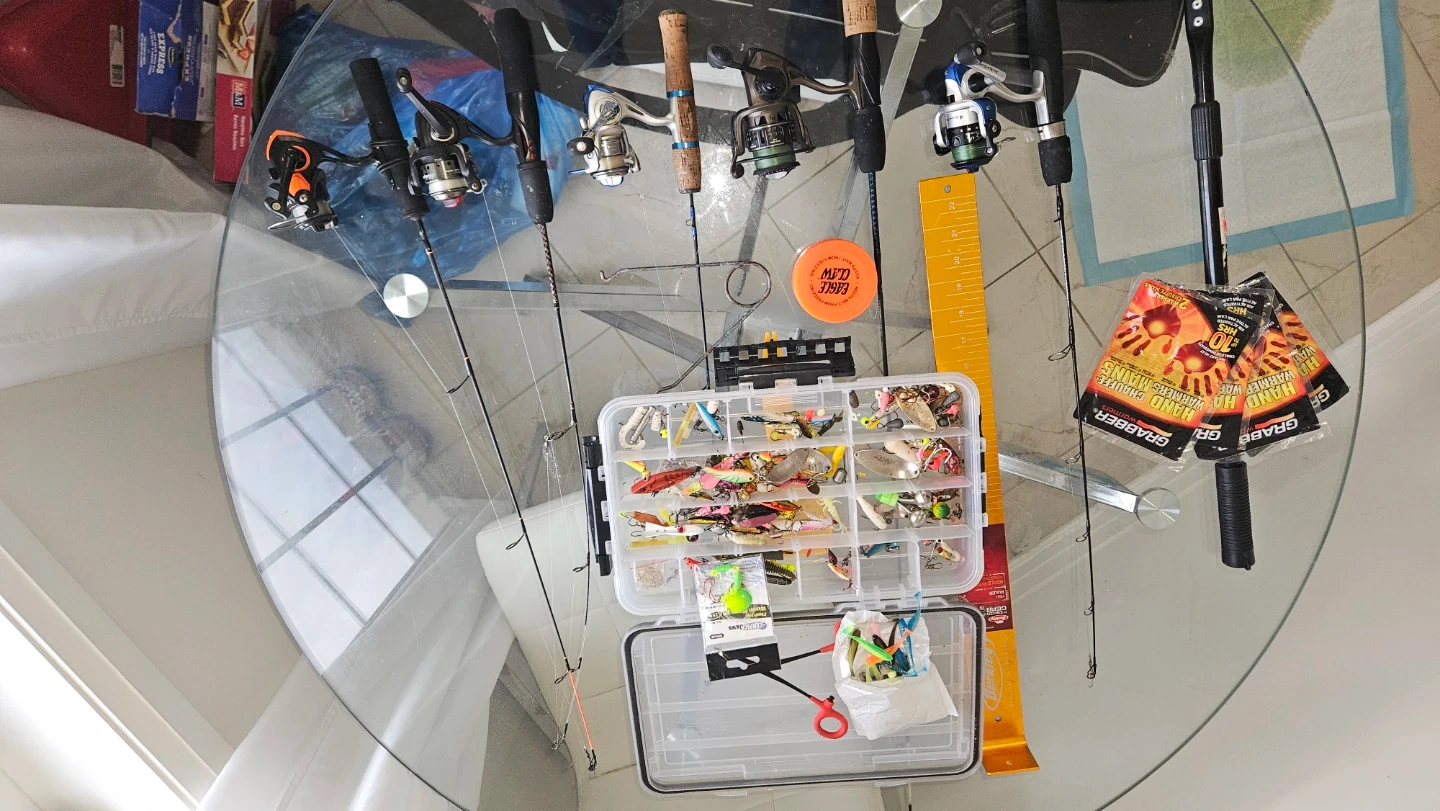 This set includes multiple fishing rods, reels, and a tackle box filled with various lures. It also comes with hand warmers and a measuring stick. A Berkley bag is included for storage and transport.