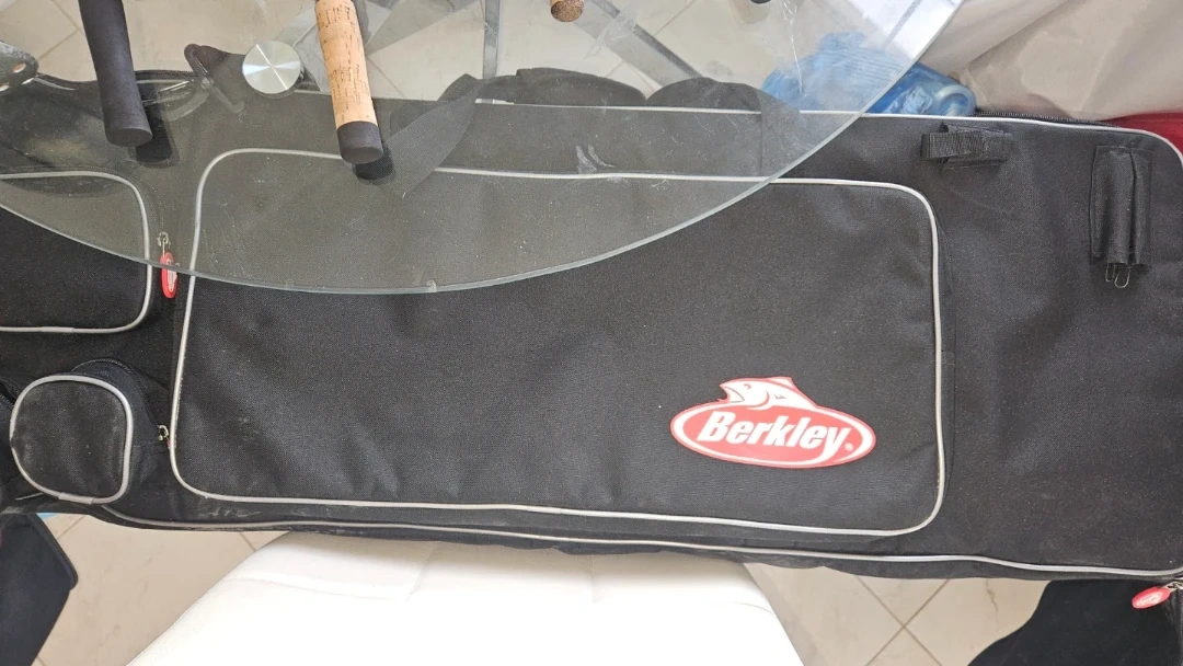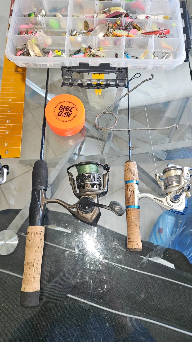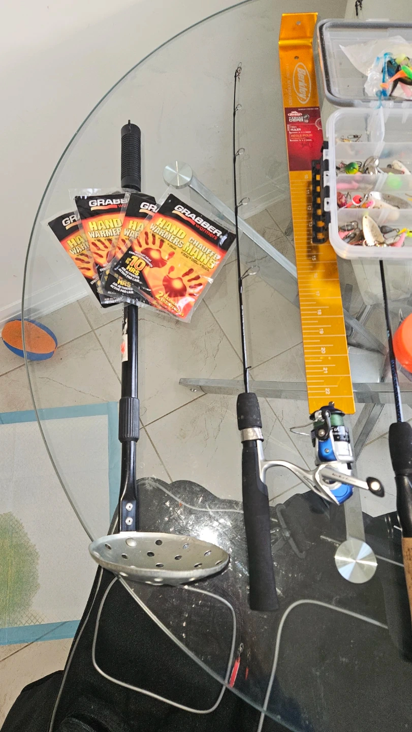 This set includes multiple fishing rods, reels, and a tackle box filled with various lures. It also comes with hand warmers and a measuring stick. A Berkley bag is included for storage and transport.