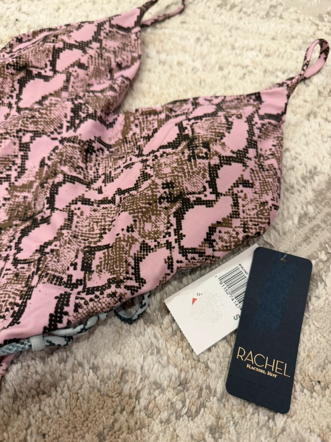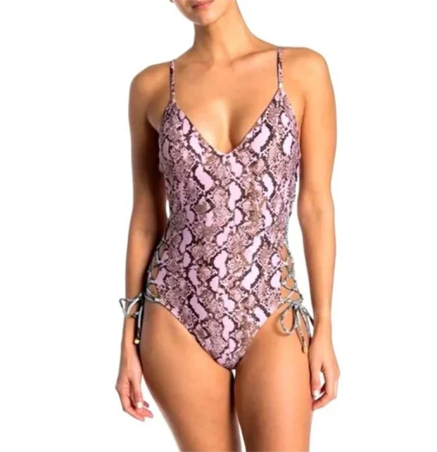 Selling a Rachel Roy one-piece swimsuit with a pink snakeskin print! It features a V-neck and lace-up detailing on the sides. Perfect for the pool or beach. Brand new with tags!