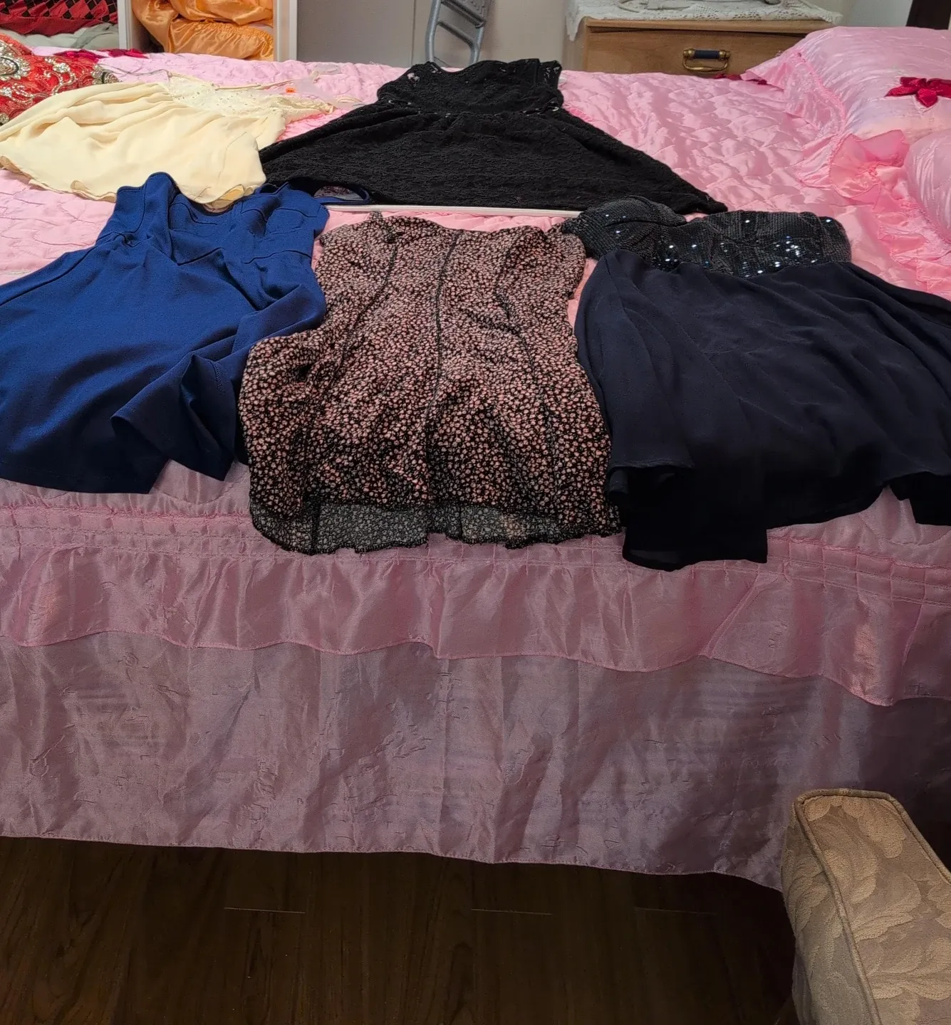 Bundle of five different women's dresses. Includes a royal blue dress, a black lace dress, a black sequined strapless dress, a cream-coloured slip dress, and a pink floral print dress. Various styles and fabrics.