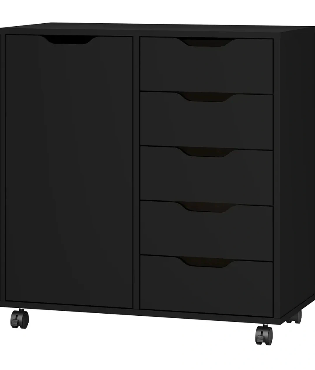 Here's a sleek black cabinet featuring a door and five drawers. It's in great shape and ready to add some stylish storage to your space! Perfect for organizing your belongings and keeping things tidy