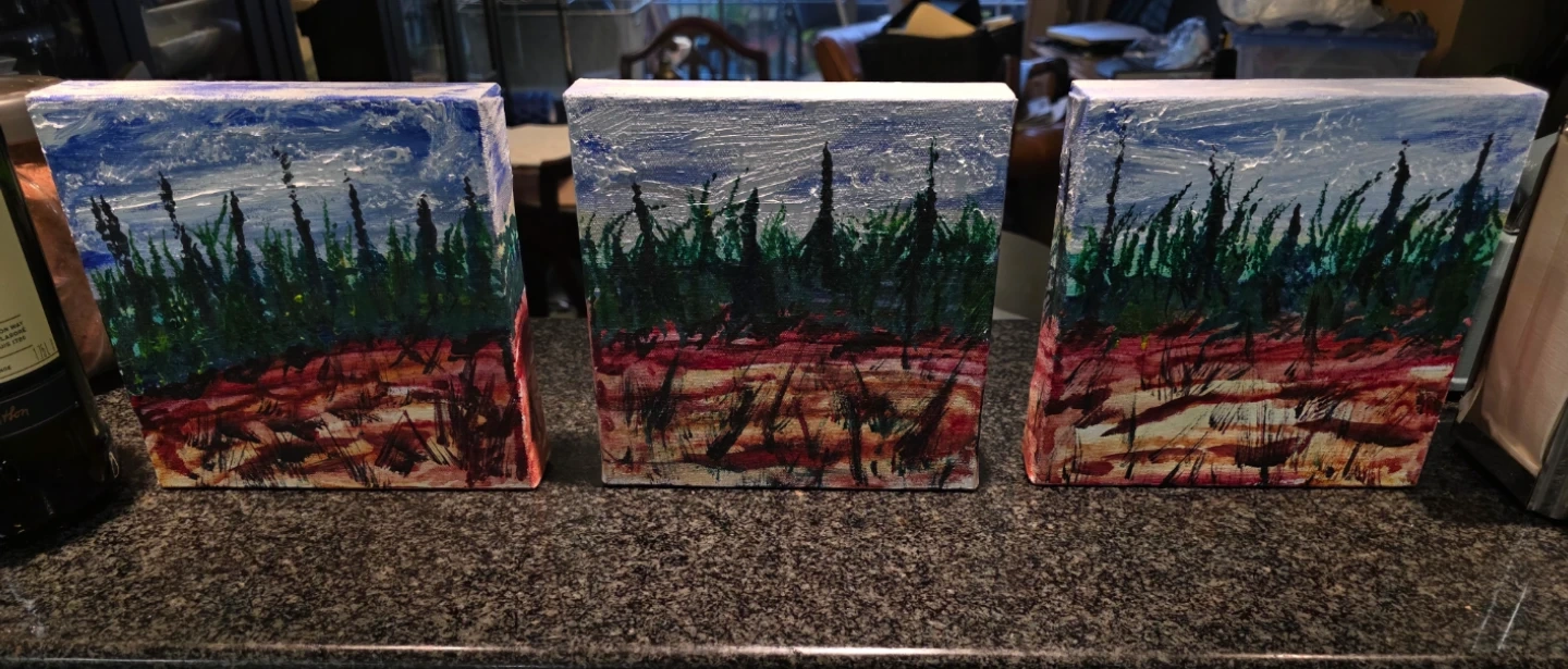 Set of three small canvas paintings featuring a landscape with tall grass and a reddish-brown ground. Painted on canvas. Perfect for adding a touch of art to any space!