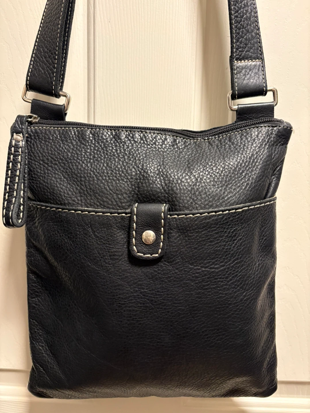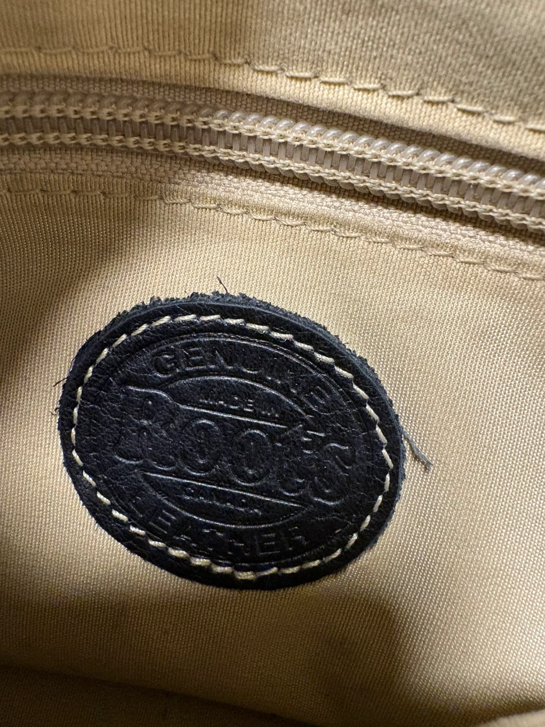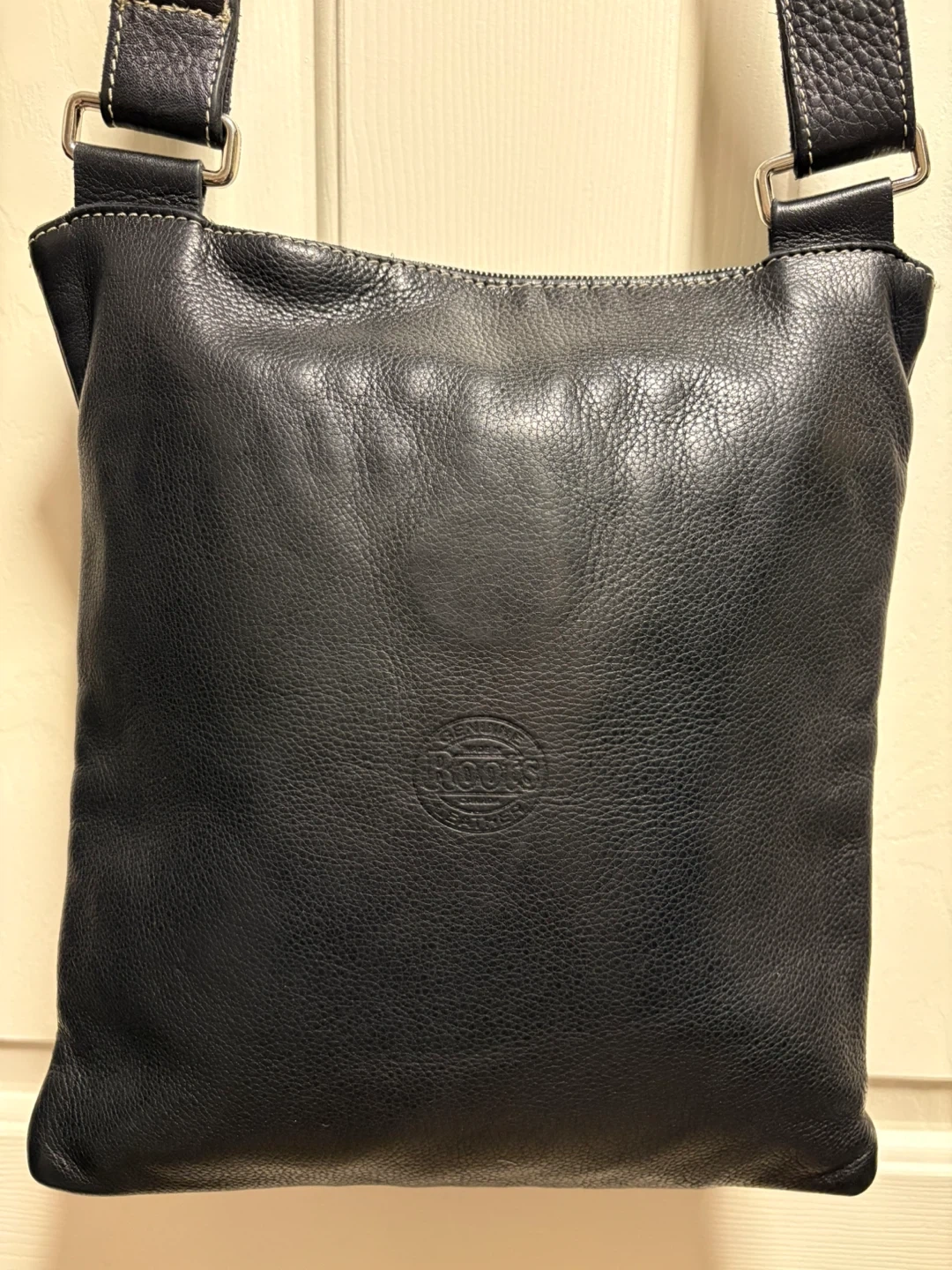 This is a Roots black leather crossbody bag. It's made from genuine leather with white stitching detail. It has a front pocket with a snap closure and a zippered main compartment. It’s in perfect “like new” condition! Pick up in Chestermere.