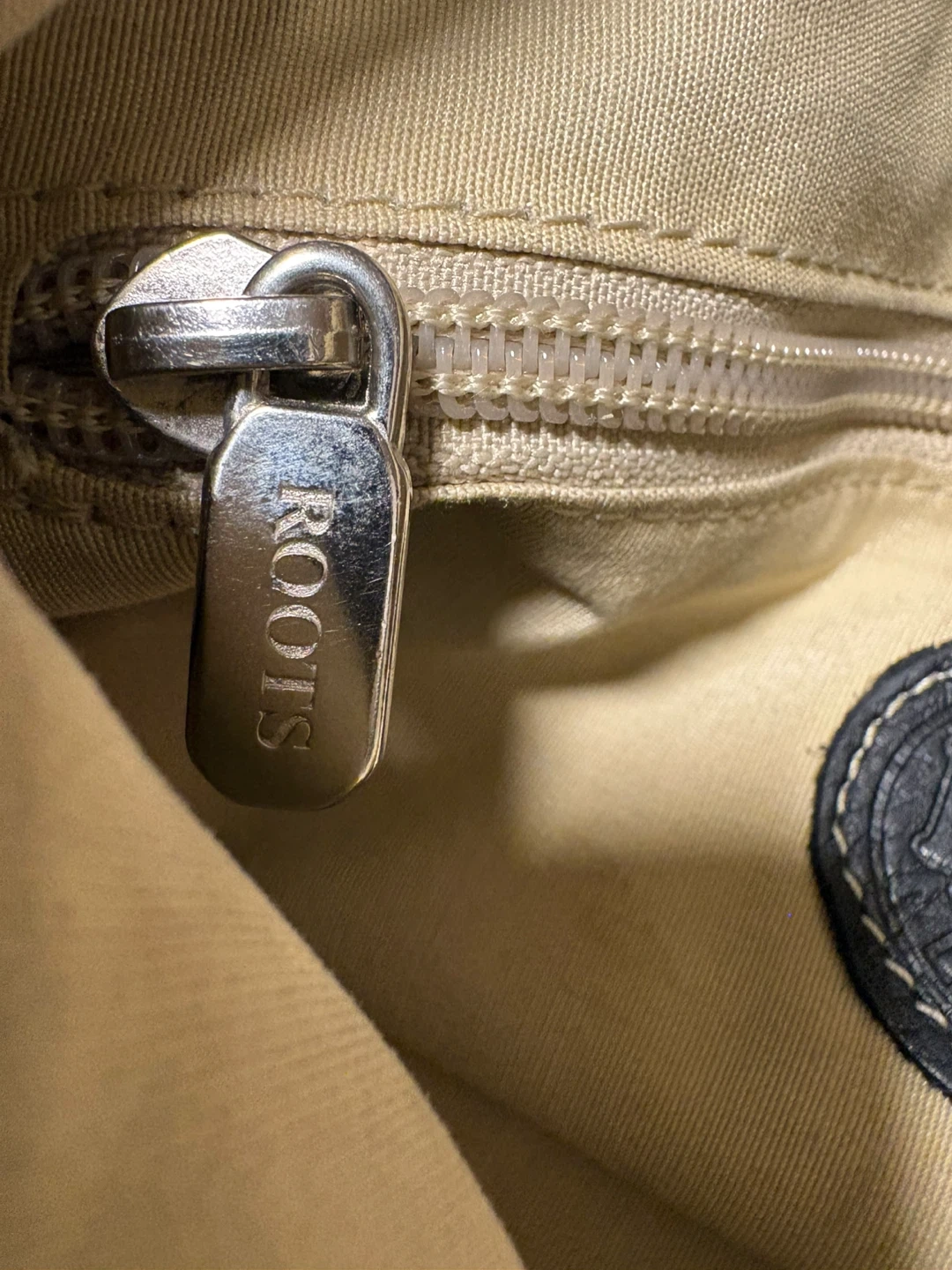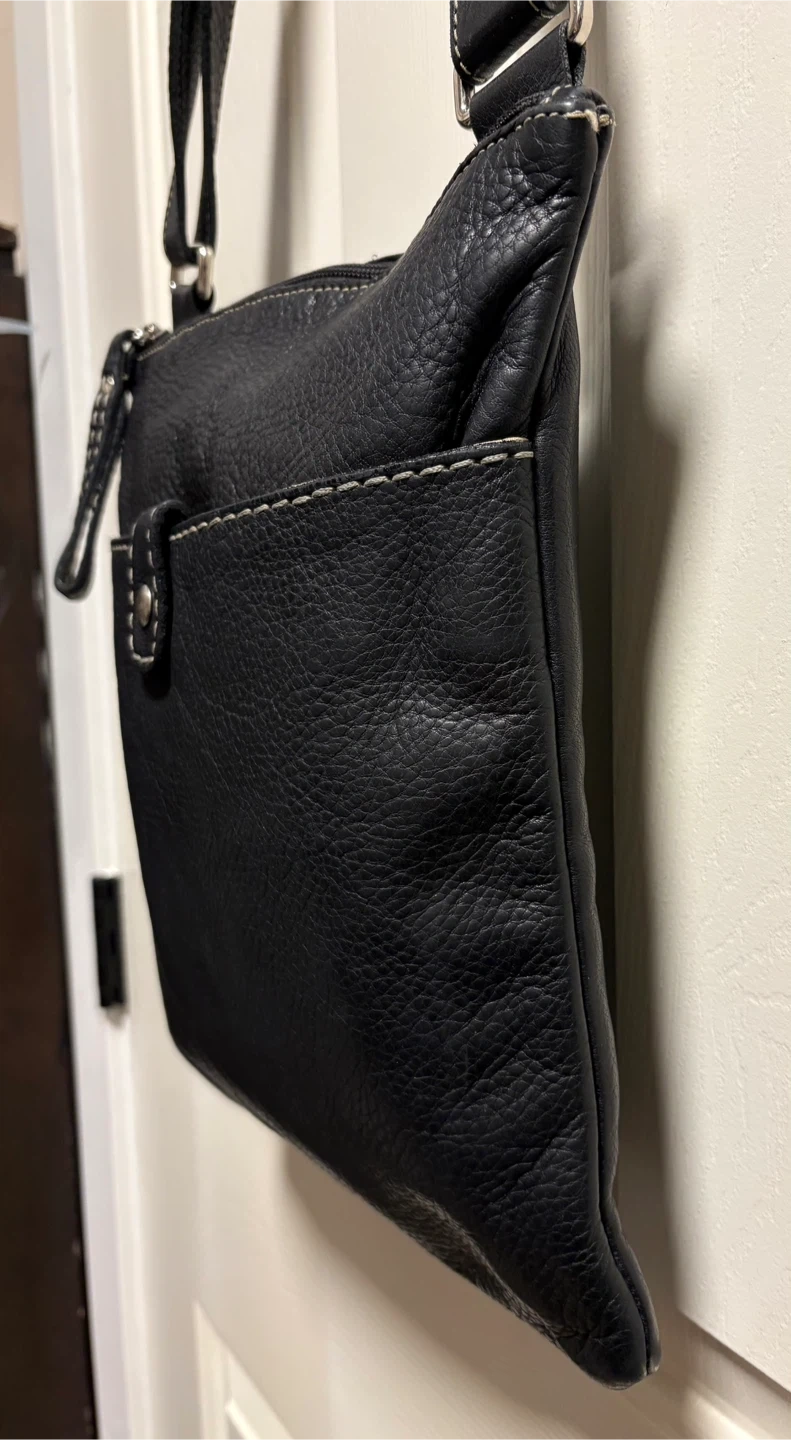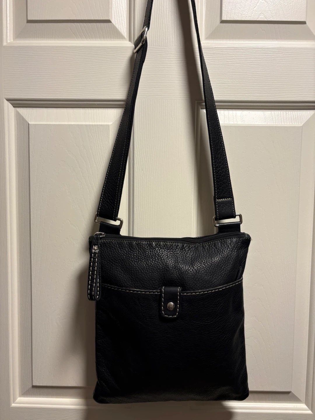 This is a Roots black leather crossbody bag. It's made from genuine leather with white stitching detail. It has a front pocket with a snap closure and a zippered main compartment. It’s in perfect “like new” condition! Pick up in Chestermere.