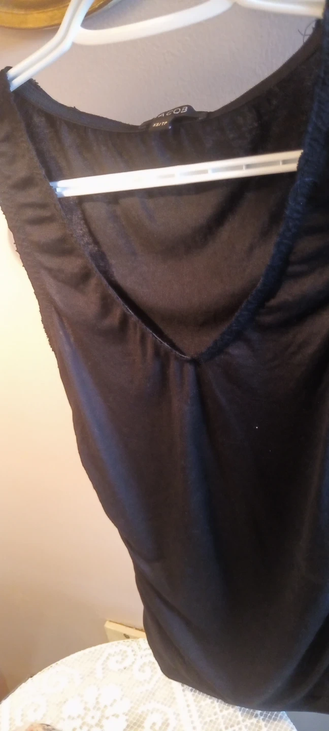 Black sleeveless tank top by JACOB. It features ruching on the sides for a flattering fit. Size is XS/TP. Made from a soft, stretchy fabric.