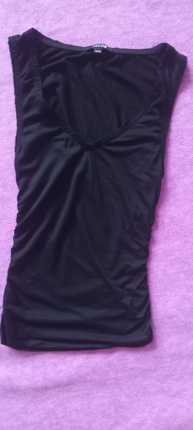 Black sleeveless tank top by JACOB. It features ruching on the sides for a flattering fit. Size is XS/TP. Made from a soft, stretchy fabric.