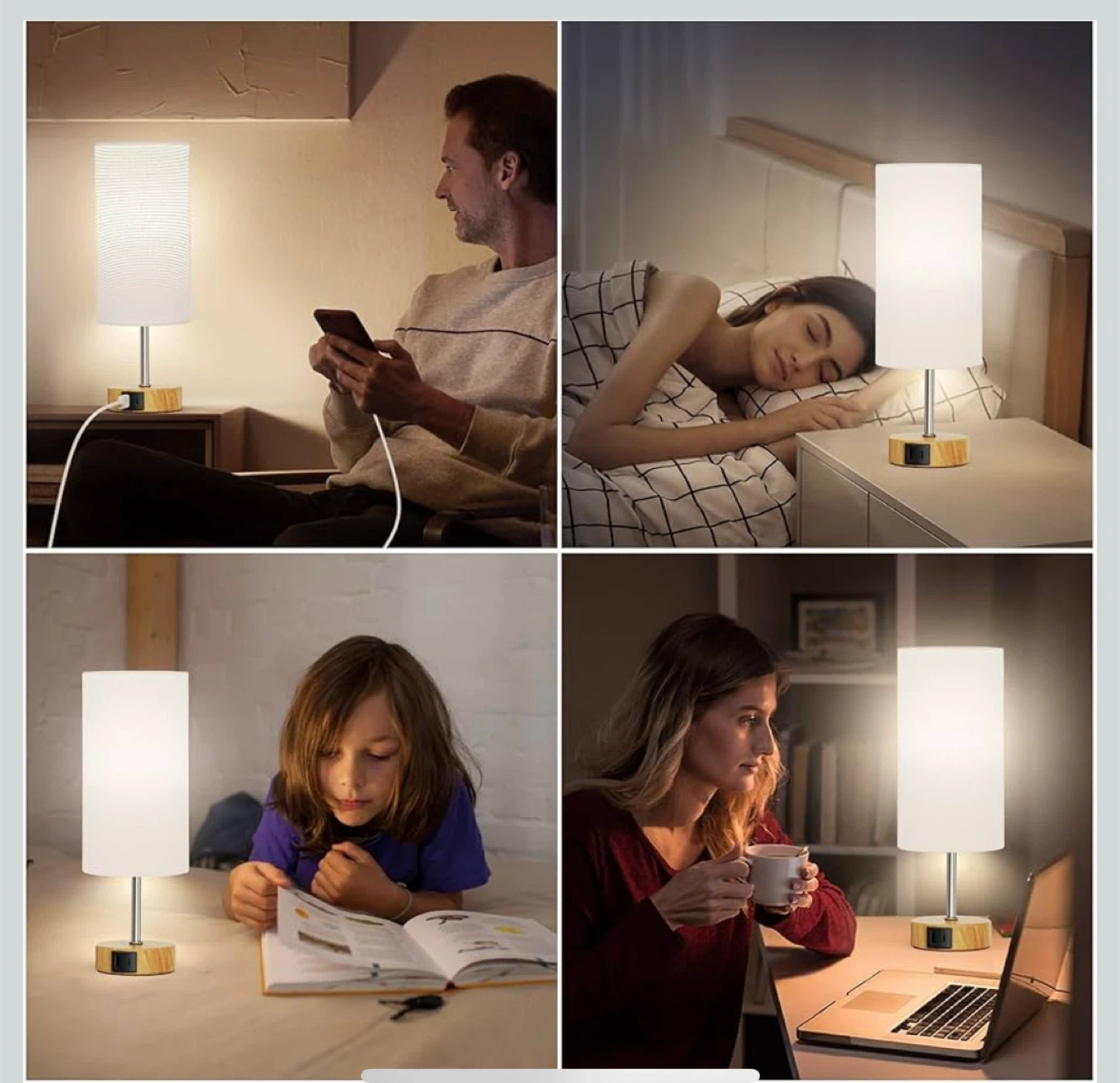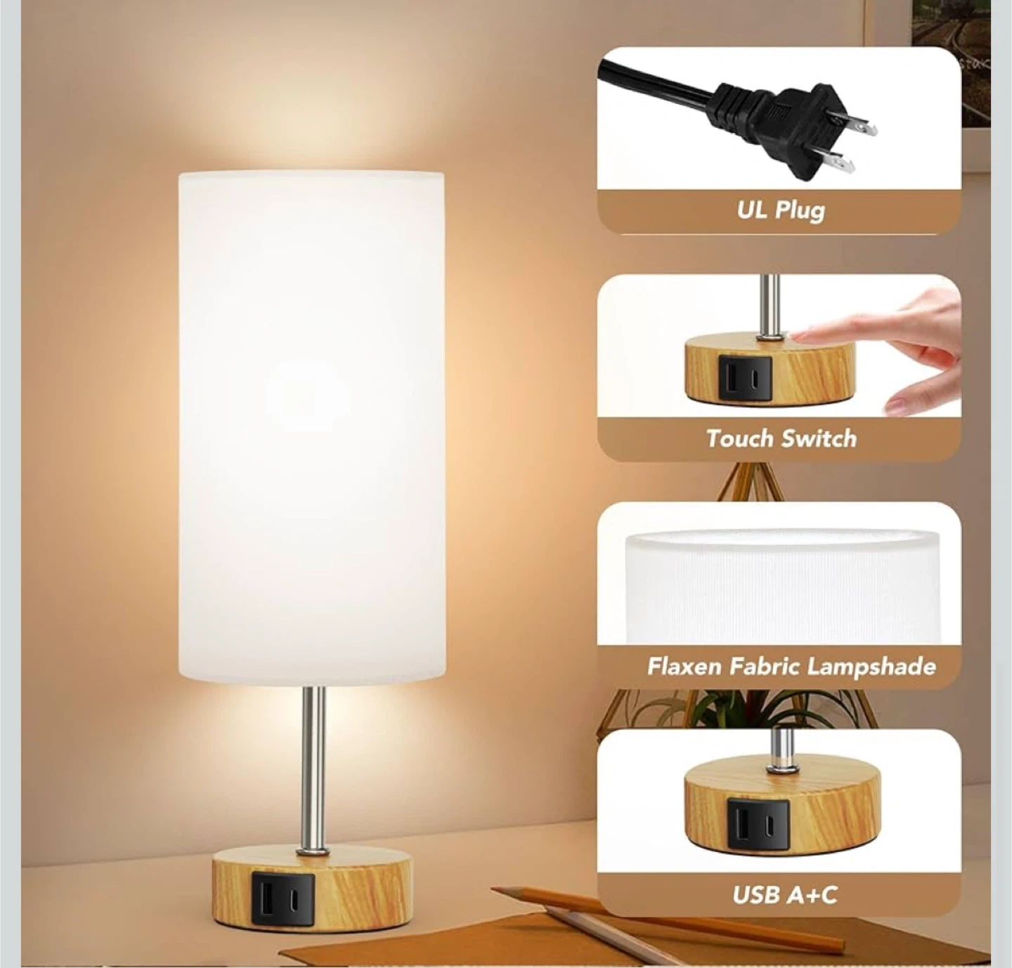 This is a new pack of touch control table lamps, featuring a 3-way dimmable function perfect for bedside use. These night lamps offer convenient touch control and adjustable brightness levels to create the perfect ambiance in your space. With dual USB ports, it's easy to charge devices while you relax.