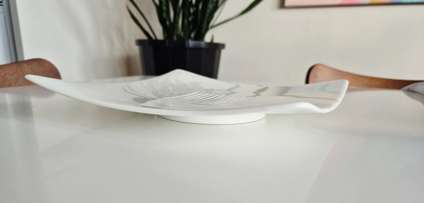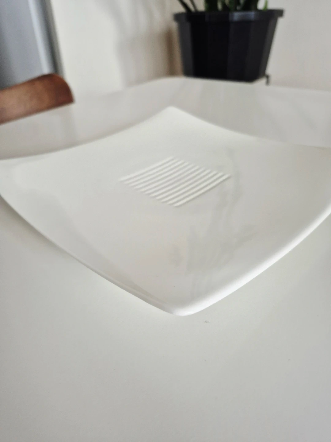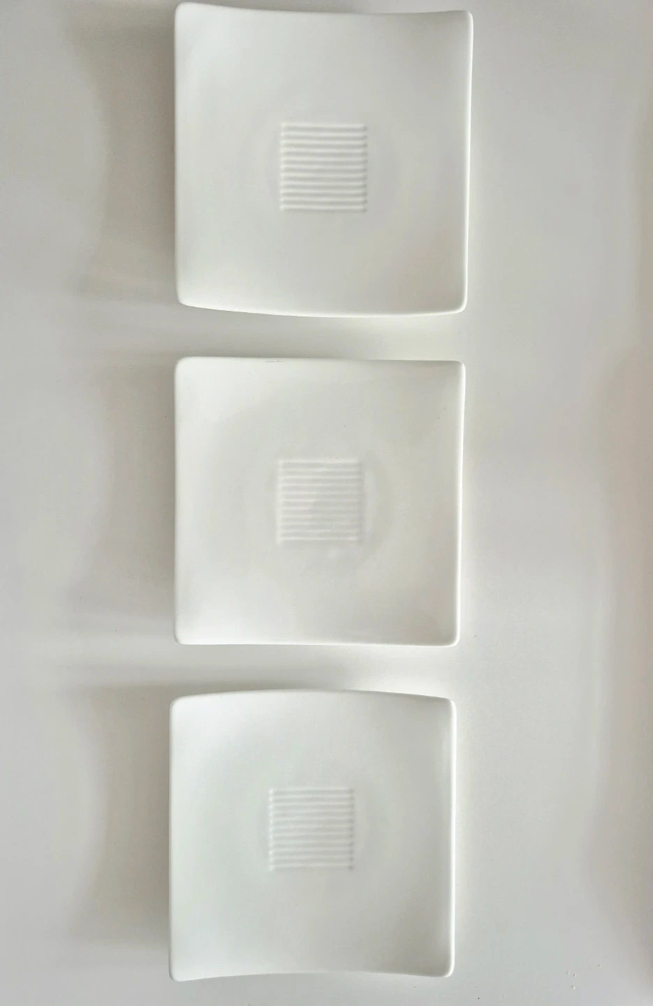 Set of three Fortessa bone china square plates. These modern-looking plates feature a subtle ribbed design in the centre. White colour.