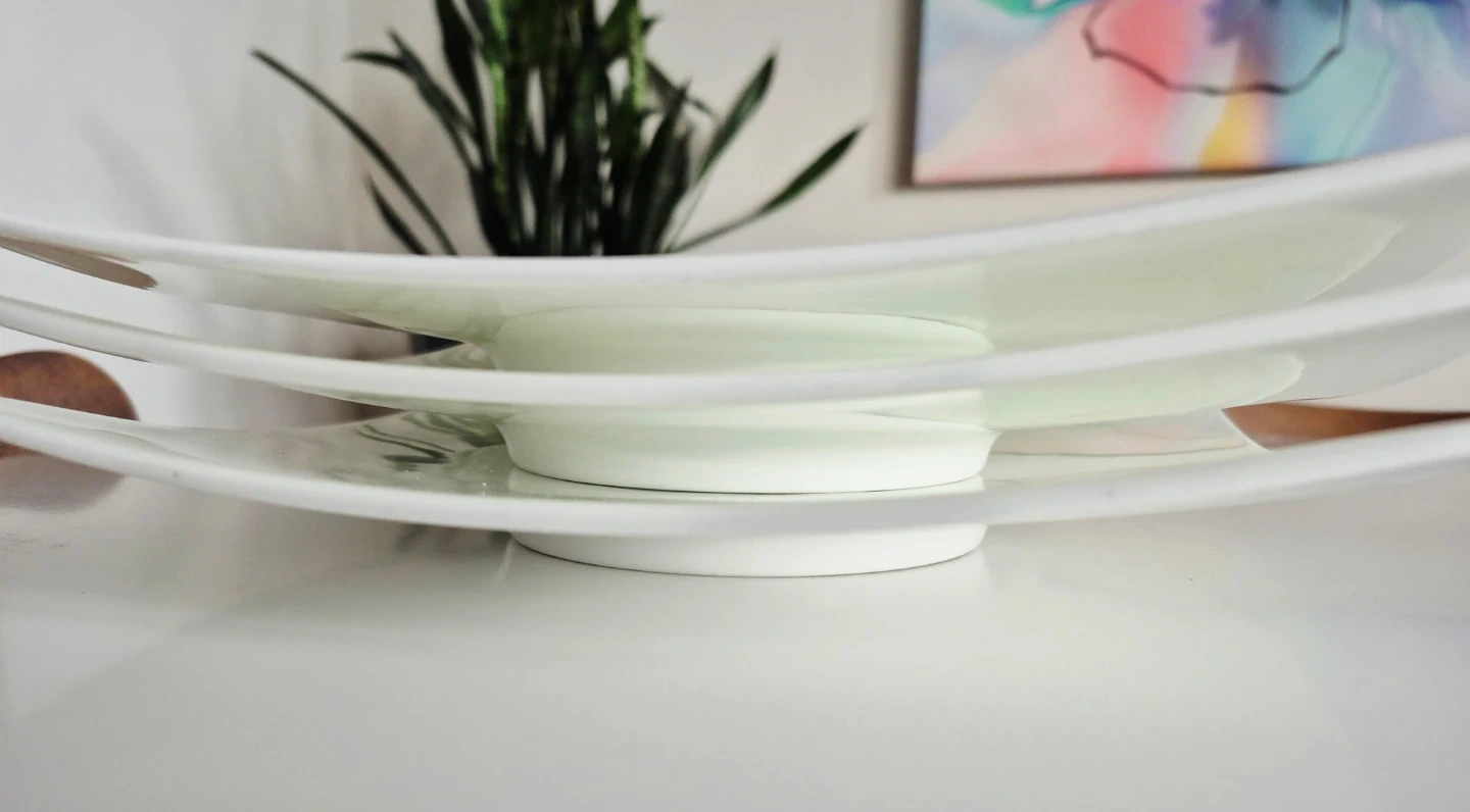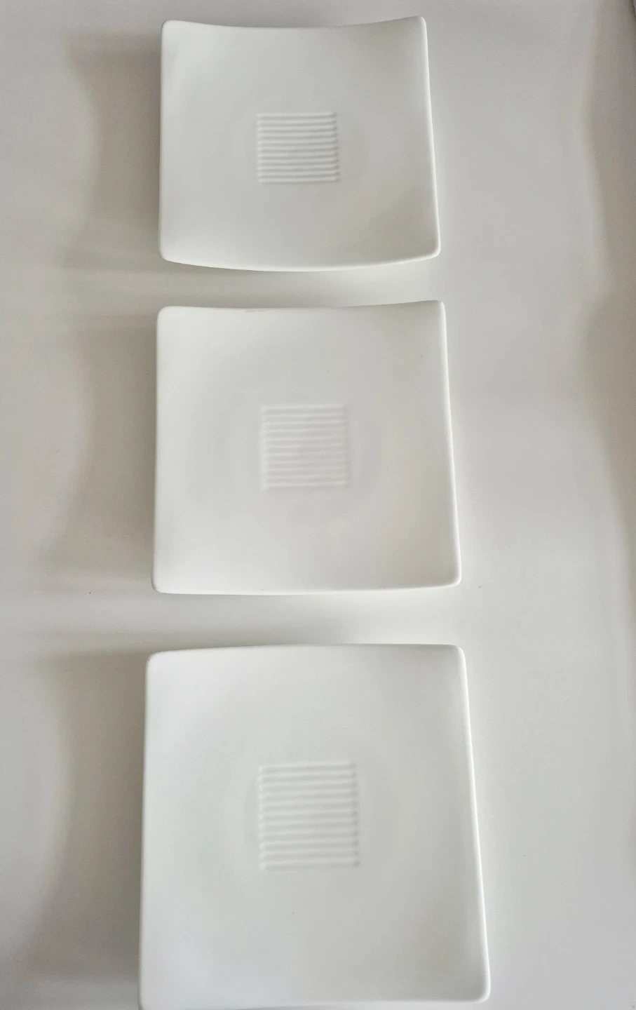 Set of three Fortessa bone china square plates. These modern-looking plates feature a subtle ribbed design in the centre. White colour.