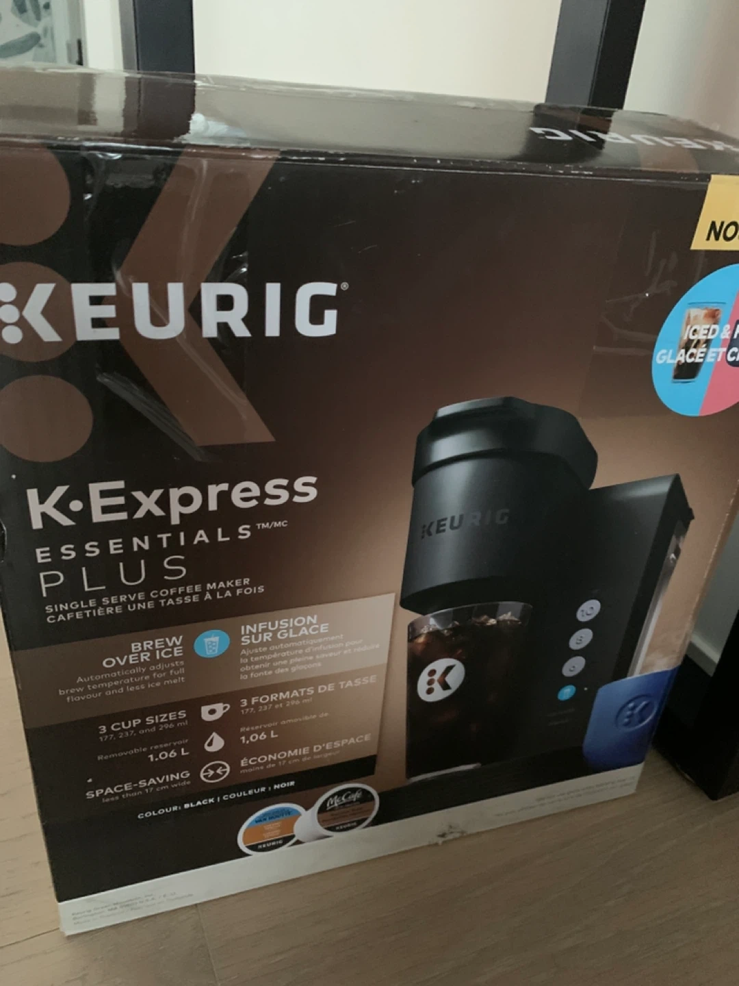 This Keurig K-Express Essentials Plus single-serve coffee maker is black. It brews over ice and offers three cup sizes: 177, 237, and 296 ml. It's a space-saving design, less than 17 cm wide, with a removable 1.06 L reservoir. You can brew iced coffee with this machine!