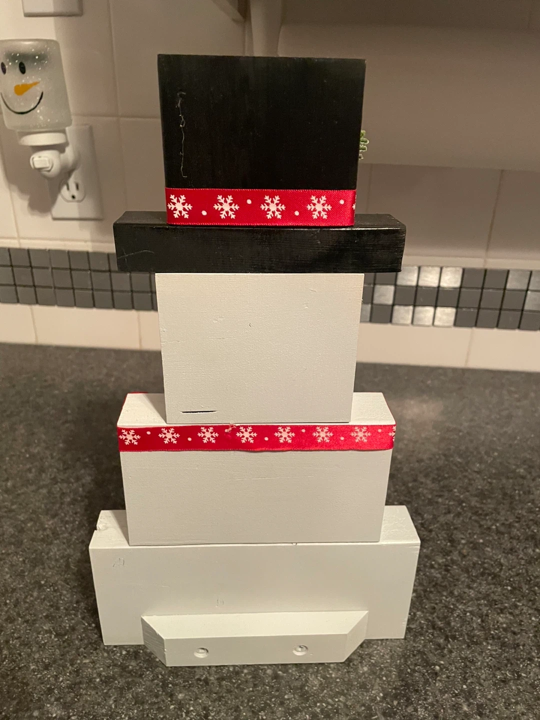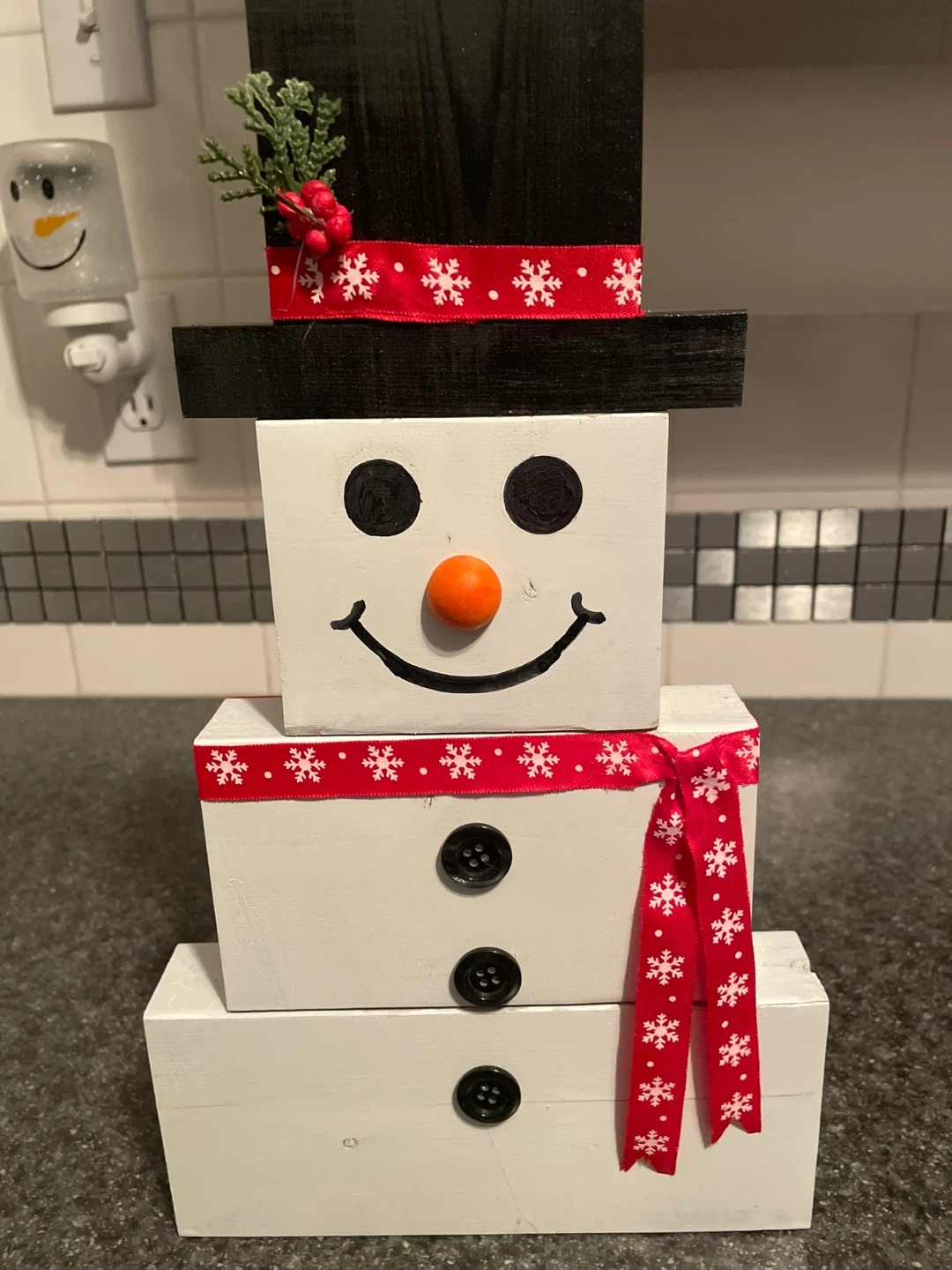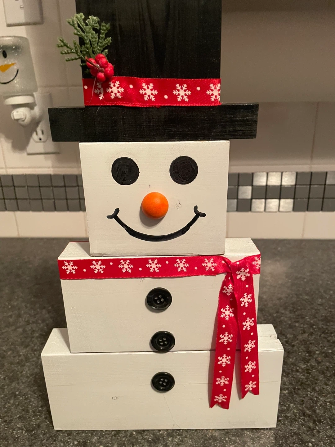 A cute, handmade wooden snowman decoration for your home! It's made from stacked wooden blocks, painted white and black, and decorated with a red ribbon and buttons. Perfect for adding a touch of winter charm to any room!