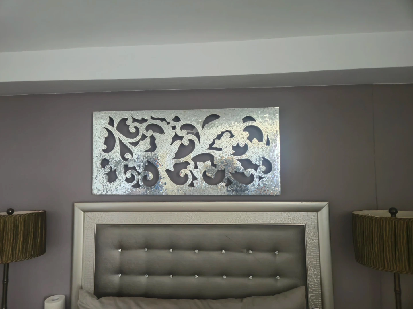 This is a decorative wall art piece with a mosaic design. It features a silver, sparkly finish that catches the light beautifully. It's a lovely accent for a bedroom or living space.
