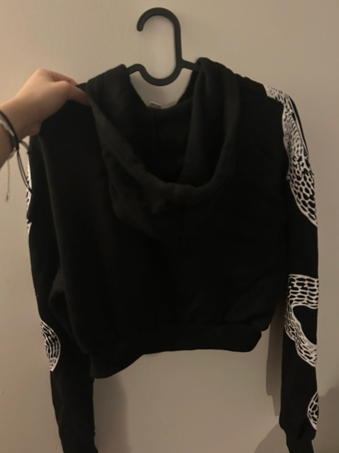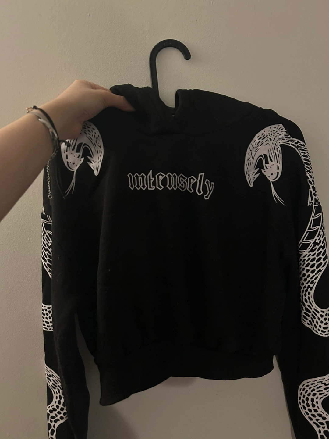 Black cropped hoodie featuring a white snake graphic on the sleeves and intensely logo on the front.