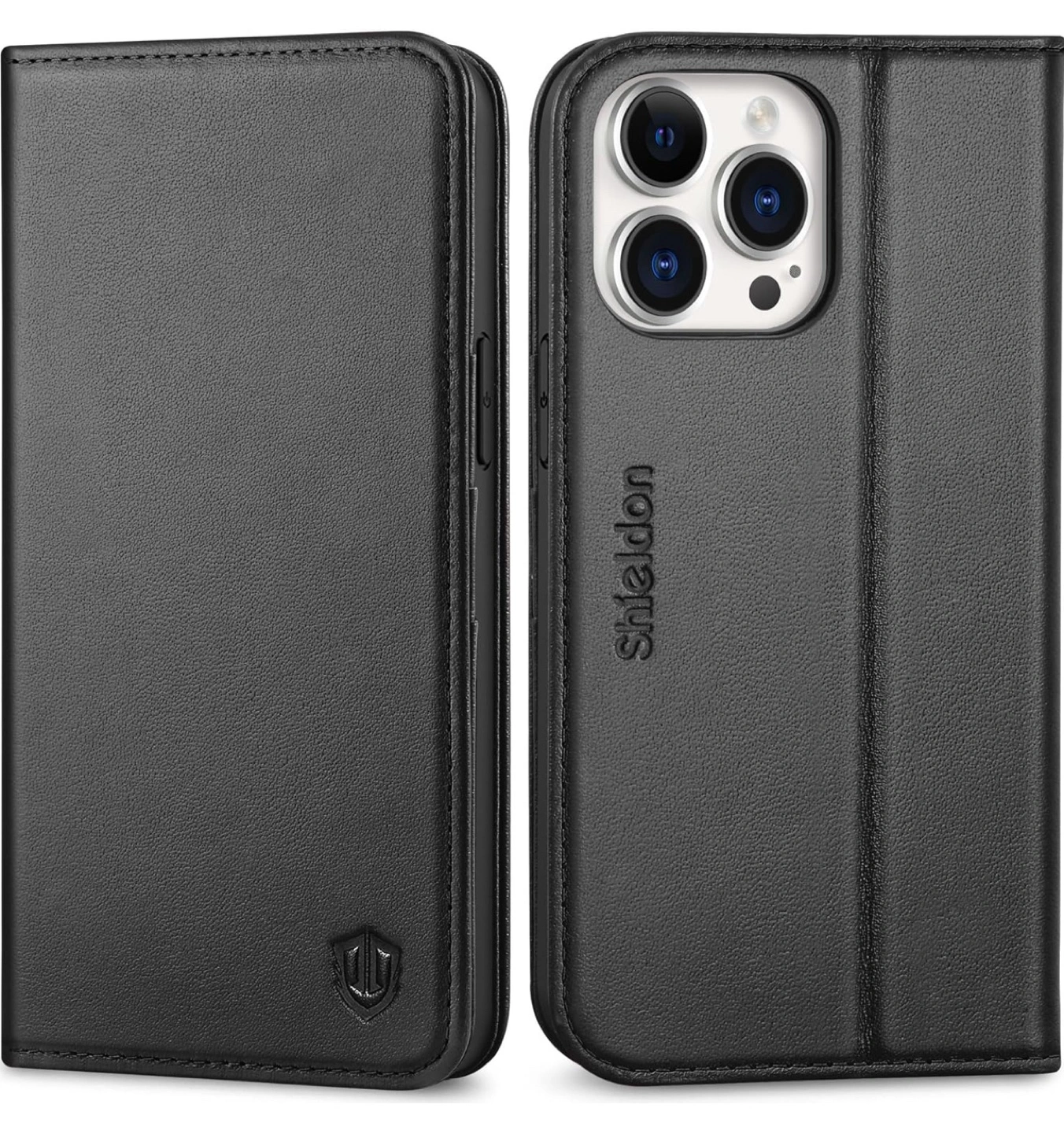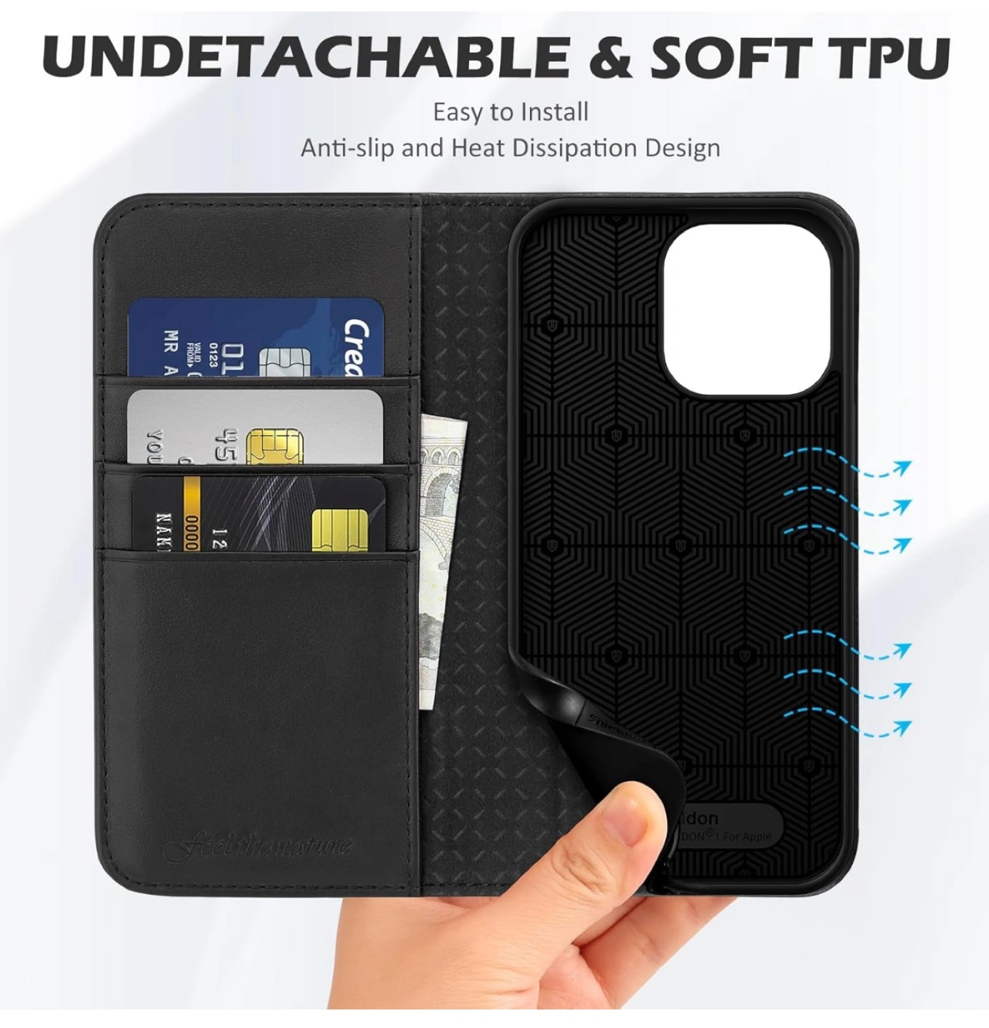 Keep your iPhone safe and stylish with this Shieldon wallet case in black! It's designed with undetachable soft TPU for easy installation and provides anti-slip and heat dissipation. Perfect for keeping your cards and phone together!