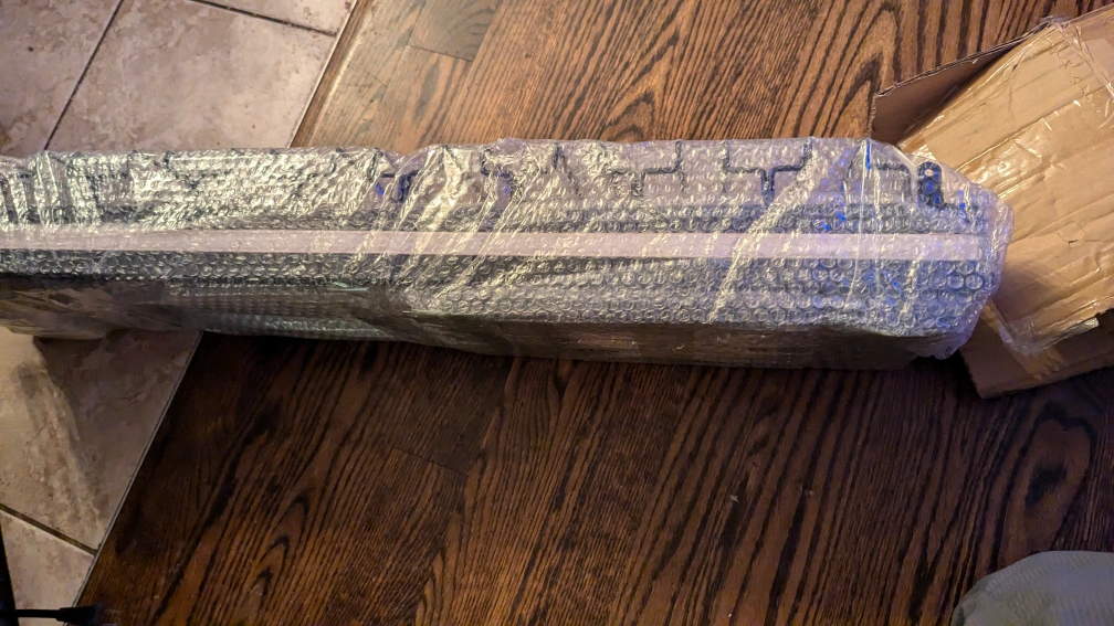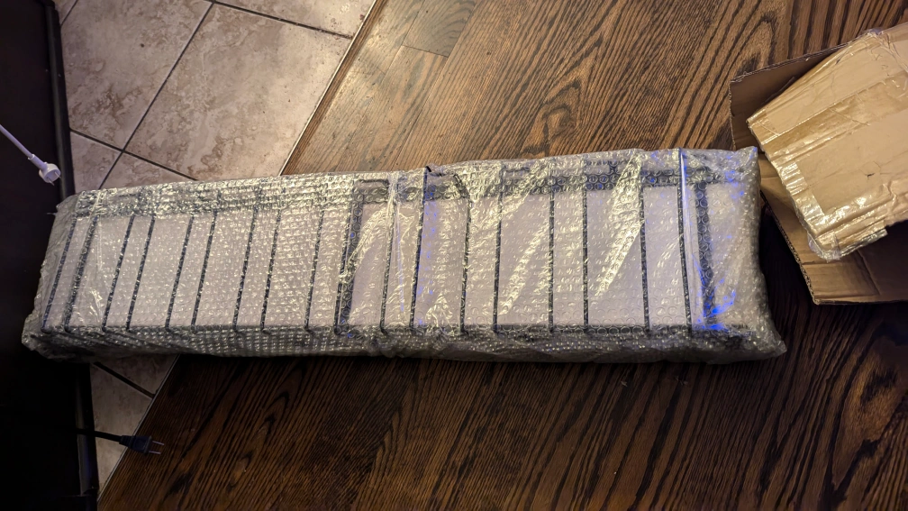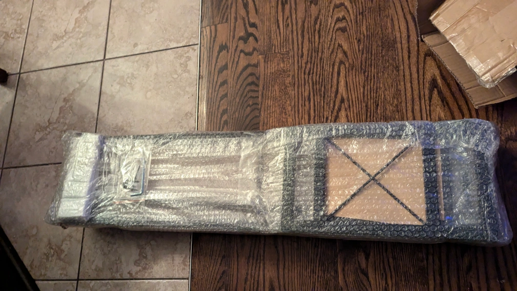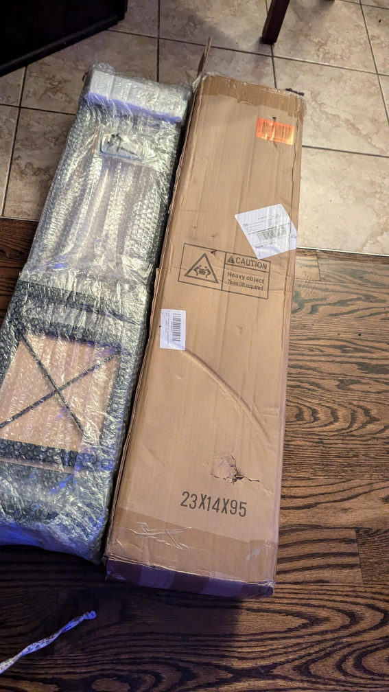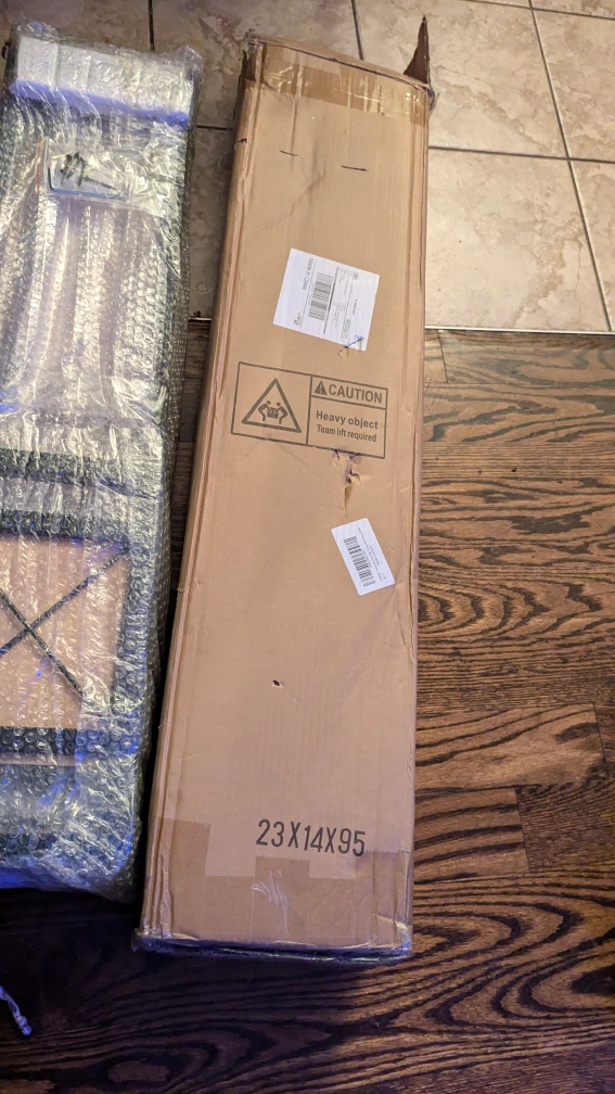 New, unopened, black, metal shelf in a long, narrow box. It's bubble wrapped. as indicated by the shipping label.modern wine rack