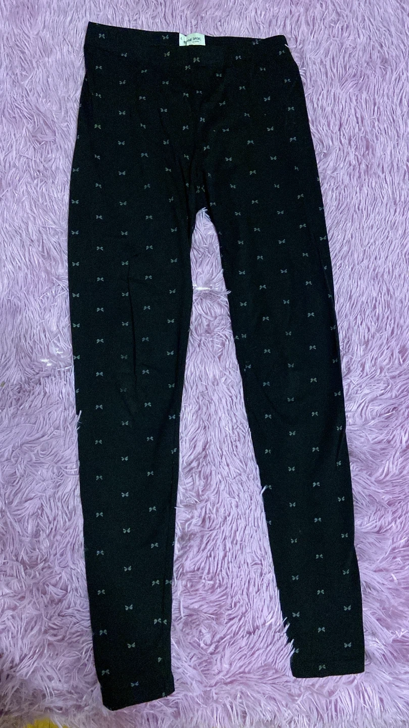 These are black leggings with a cute all-over bow pattern. They're made of a comfortable, stretchy material. Size is medium and works for small size too. Great for casual wear!