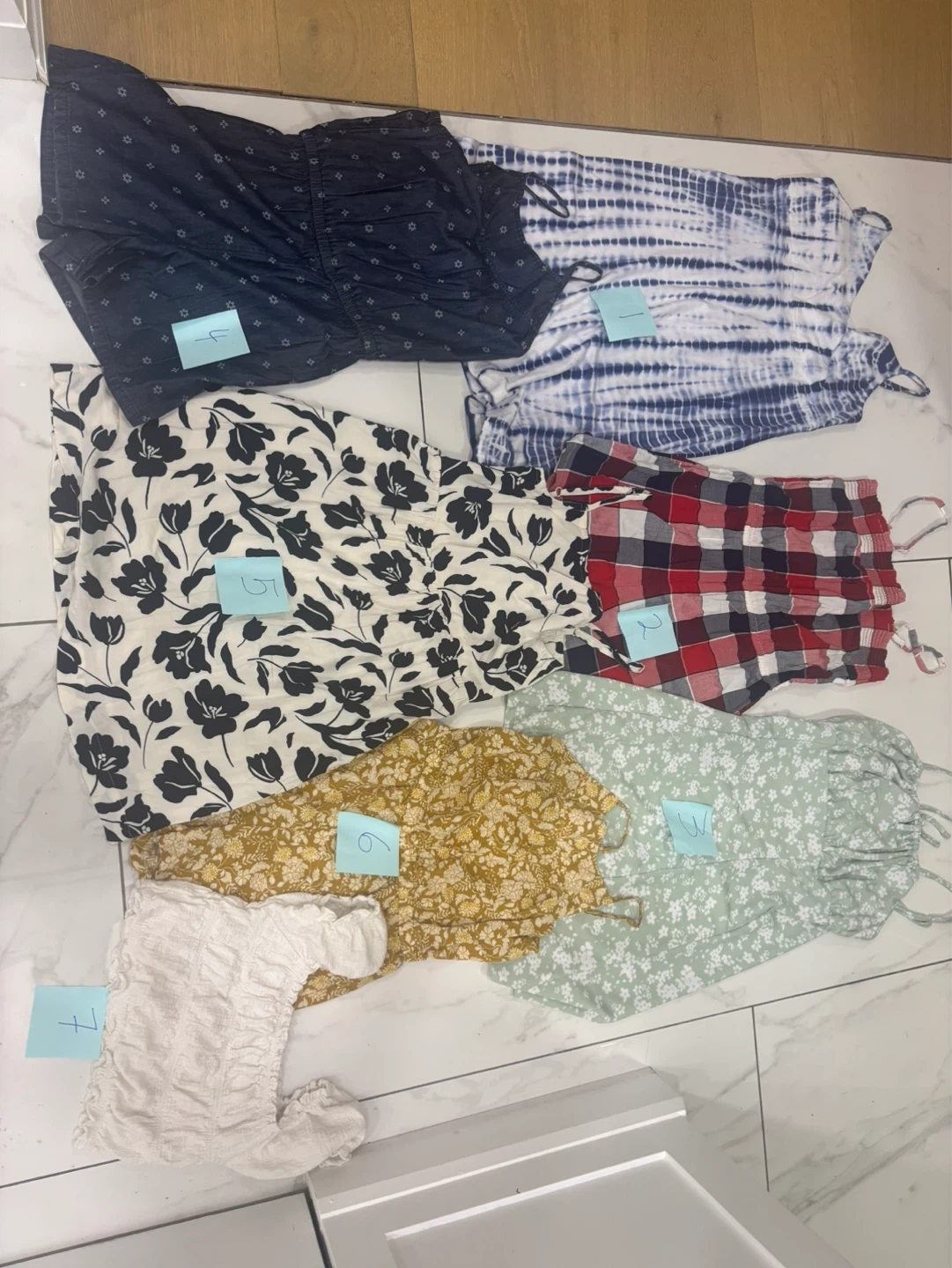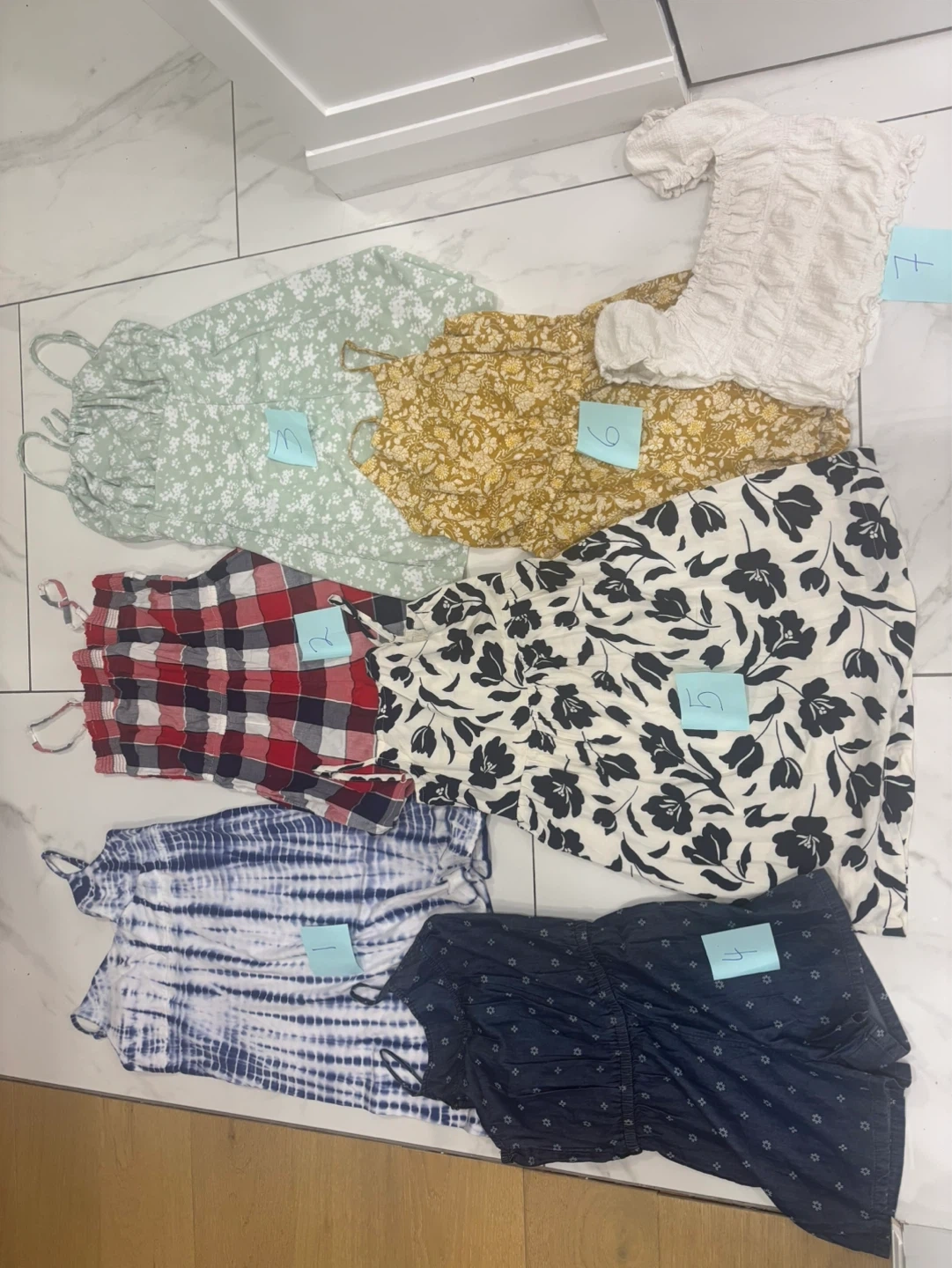 Seven cute pieces for warm weather! Includes tie-dye, plaid, floral, and solid prints. Various styles perfect for everyday wear or special occasions. Great for playtime or outings!