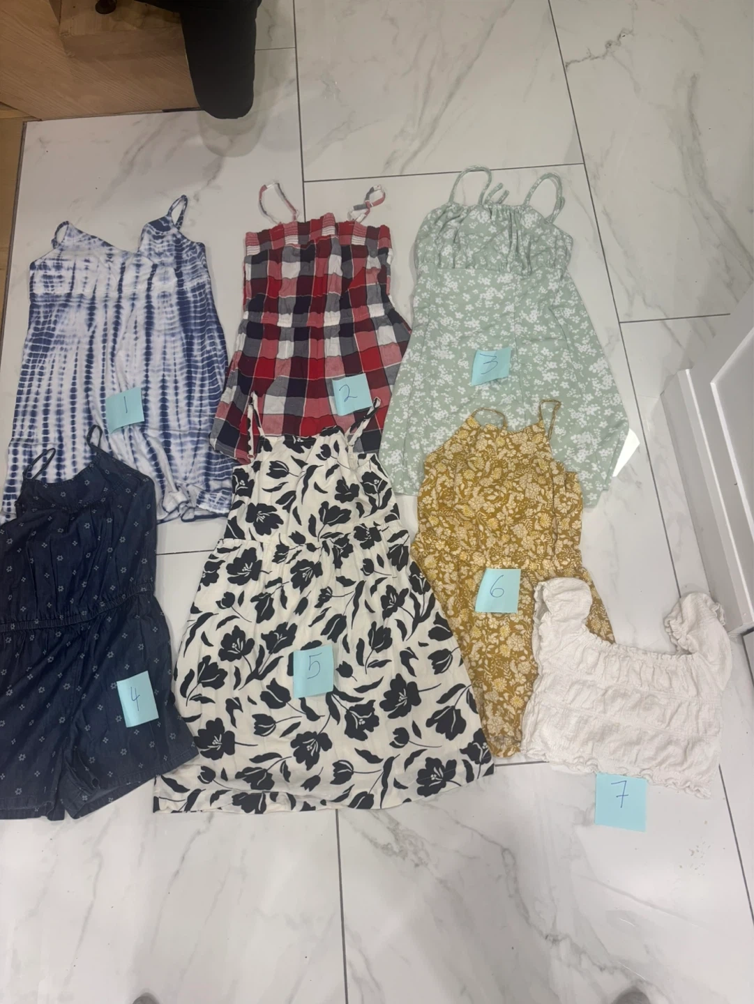 Seven cute pieces for warm weather! Includes tie-dye, plaid, floral, and solid prints. Various styles perfect for everyday wear or special occasions. Great for playtime or outings!