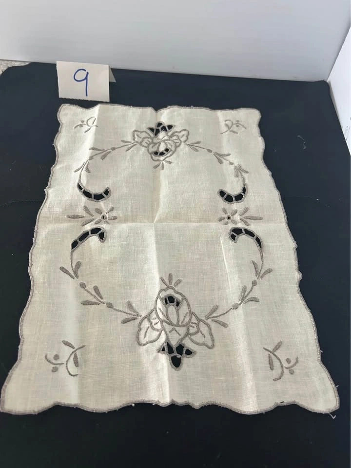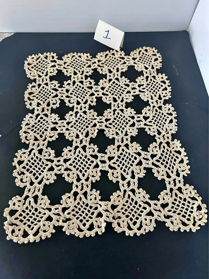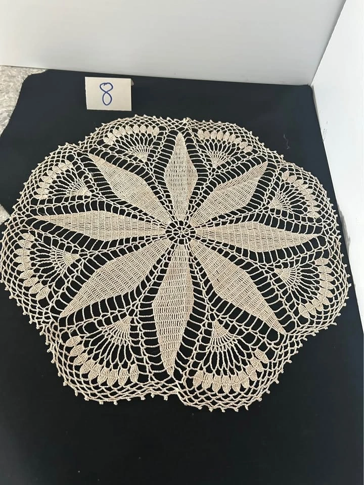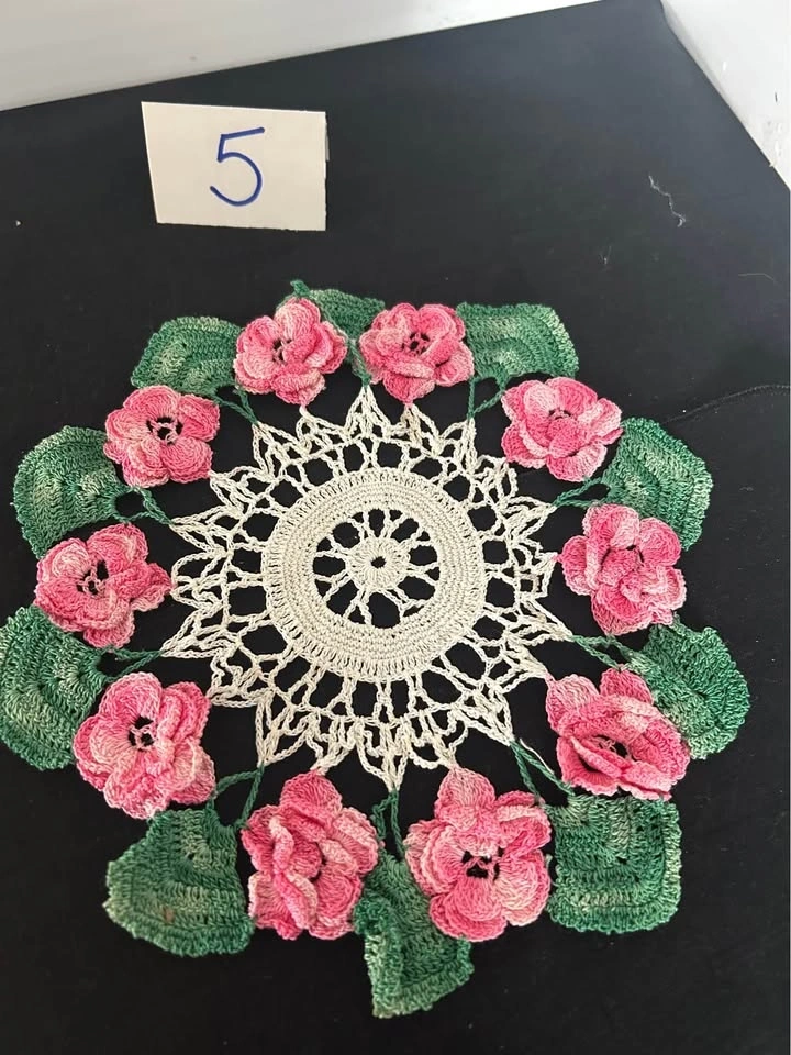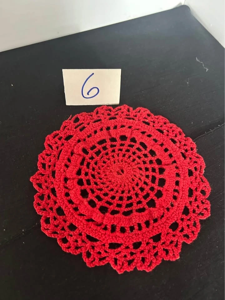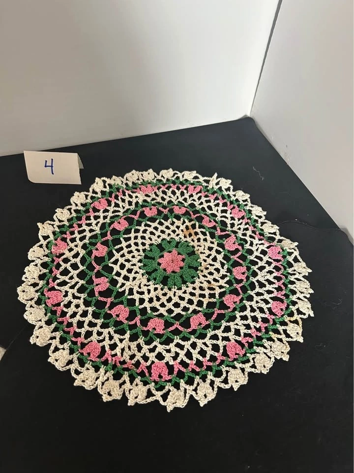 Vintage hand crochet dollies. Discounts for multiple purchases or $25.00 for the lot. All measurements are approximate. 1 rectangle 13.5” x 11. 2 oval 12” x 7” - slight pink staining visible. 3 round yellow - pair 6”. 4 round - white, pink & green - 11”. 5 round - pink flowers - 9”. 6 round - red - 6.25”. 7 round - beige - 8.5”. 8 round - beige - 14”. 9 rectangle- fabrics 13” x 8.75. Let me know if you're interested!