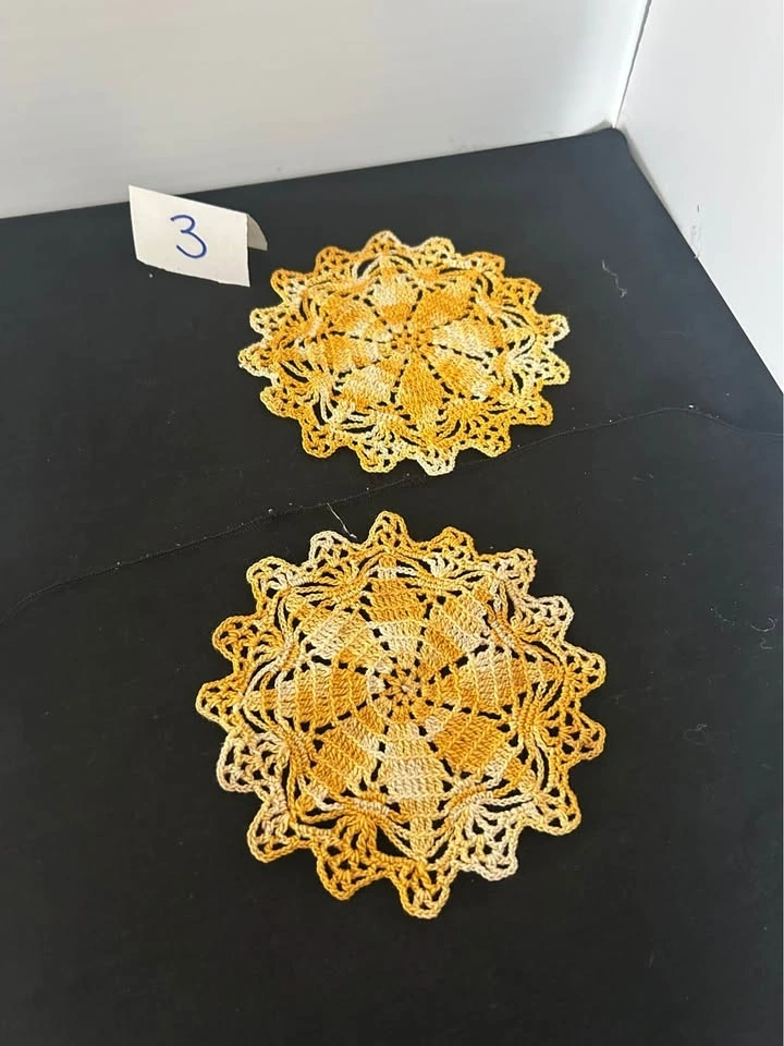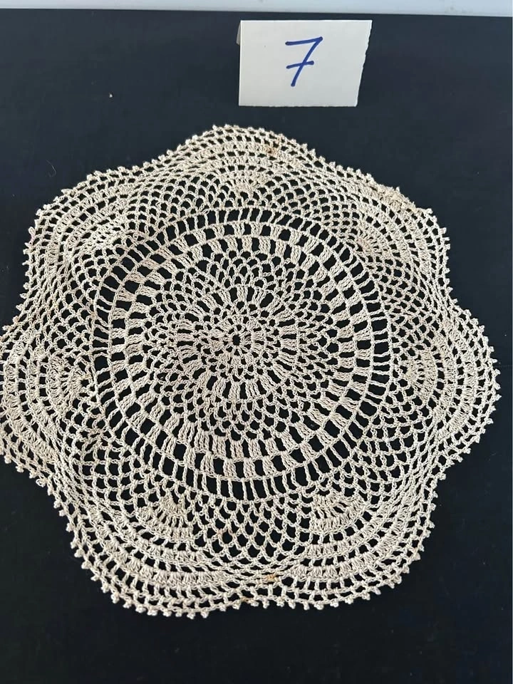 Vintage hand crochet dollies. Discounts for multiple purchases or $25.00 for the lot. All measurements are approximate. 1 rectangle 13.5” x 11. 2 oval 12” x 7” - slight pink staining visible. 3 round yellow - pair 6”. 4 round - white, pink & green - 11”. 5 round - pink flowers - 9”. 6 round - red - 6.25”. 7 round - beige - 8.5”. 8 round - beige - 14”. 9 rectangle- fabrics 13” x 8.75. Let me know if you're interested!