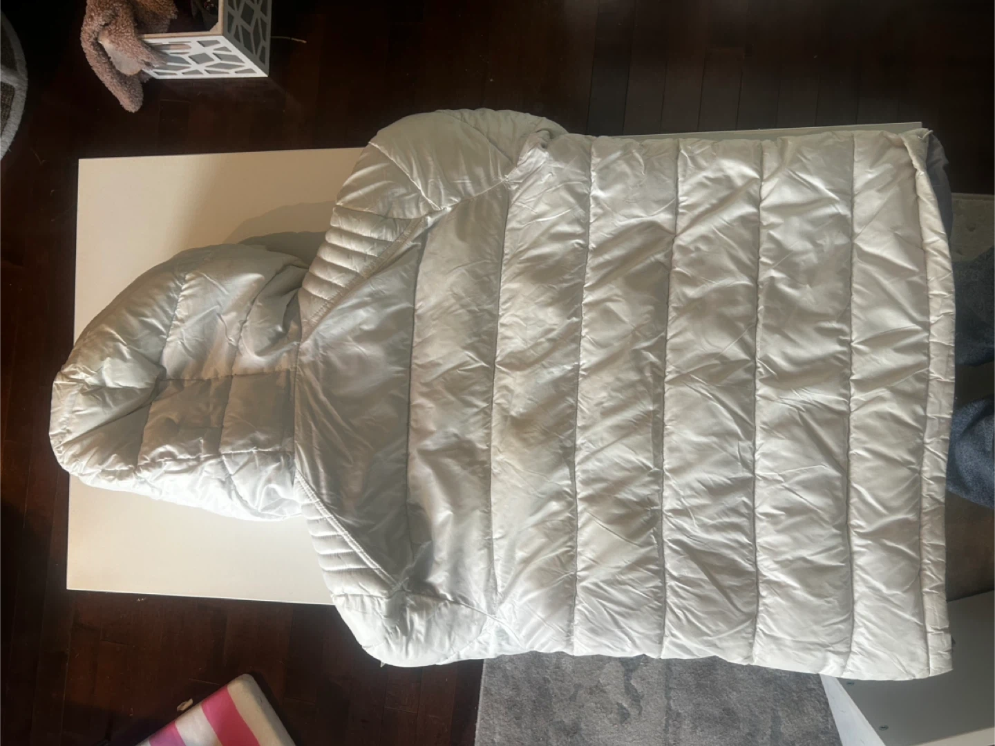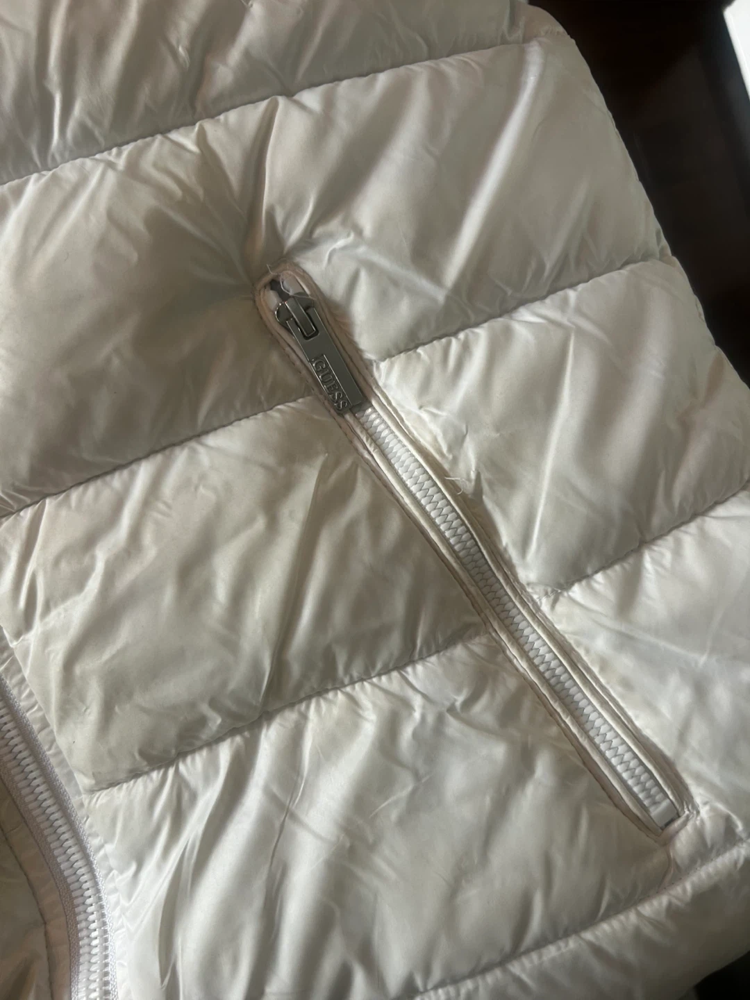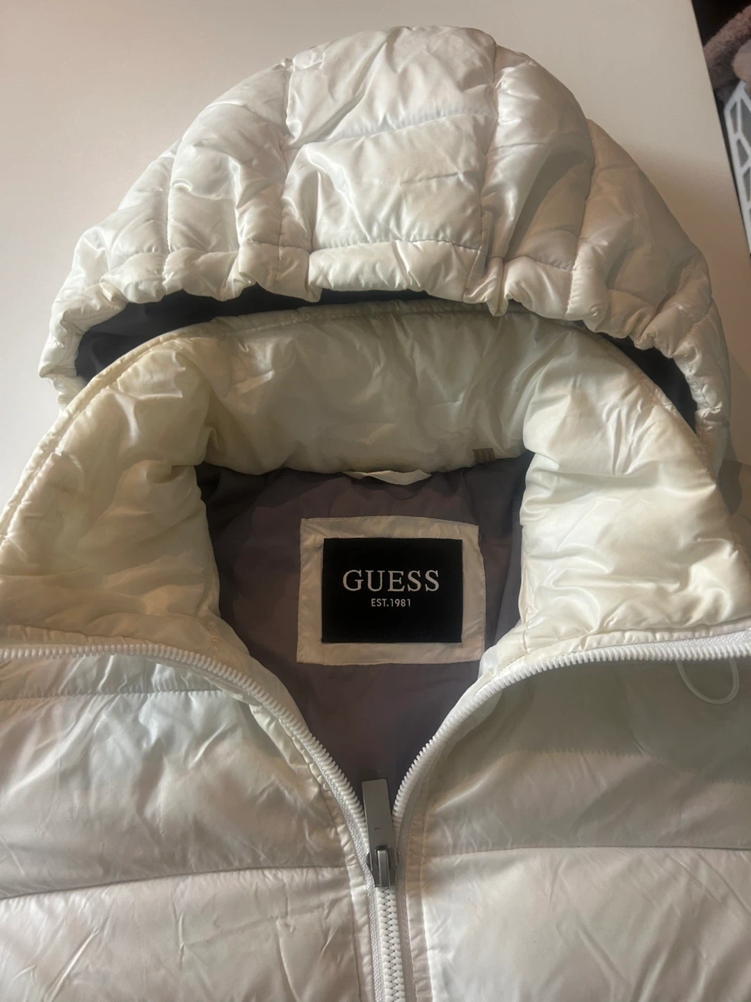 This is a white GUESS puffer jacket with a hood. It's a stylish and warm winter coat. Features a full zip closure and pockets.