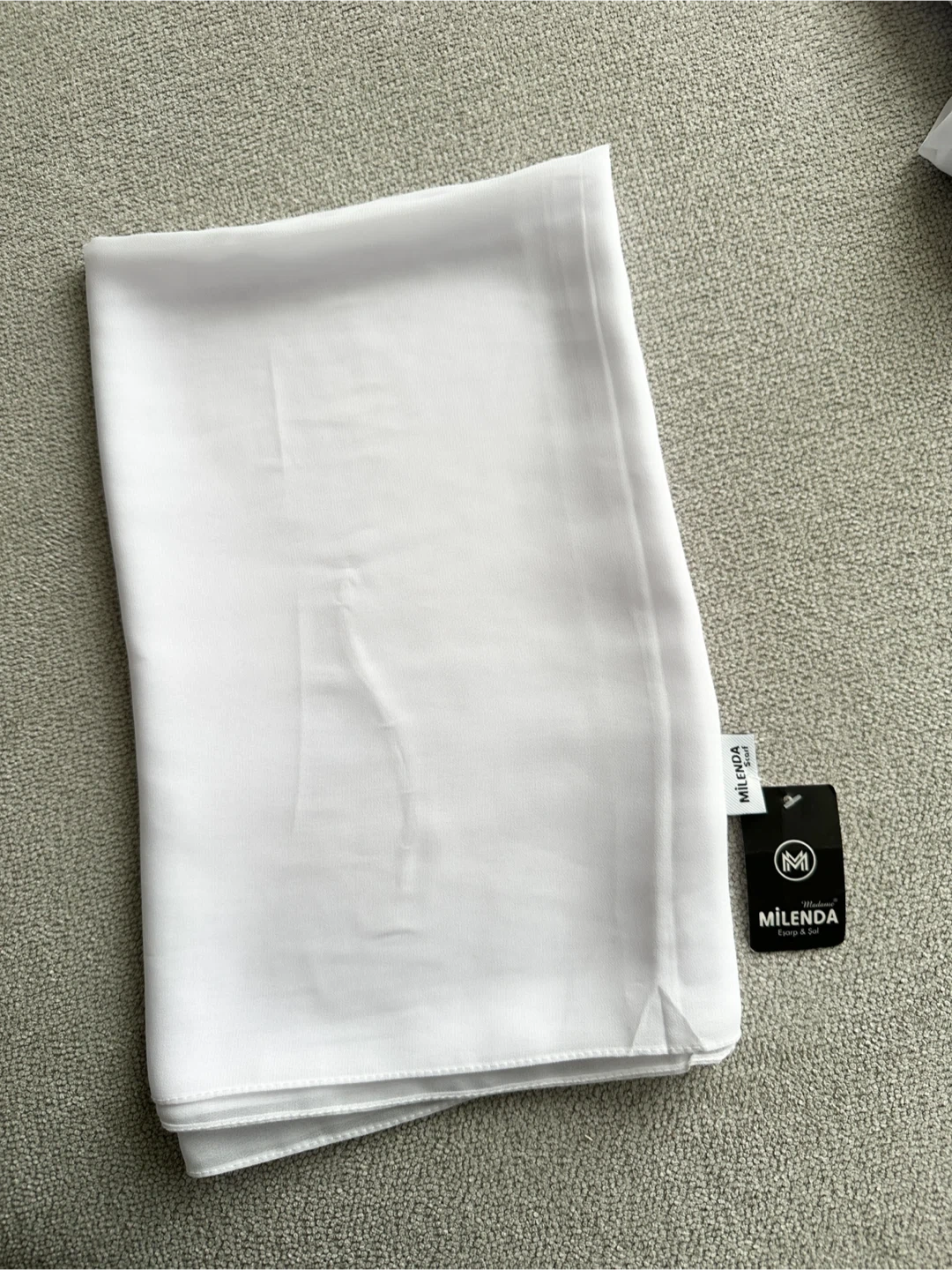 A new MILENDA white scarf. It's made from a lightweight chiffon fabric, perfect for adding a touch of elegance. This scarf offers versatility for various styles and occasions.
