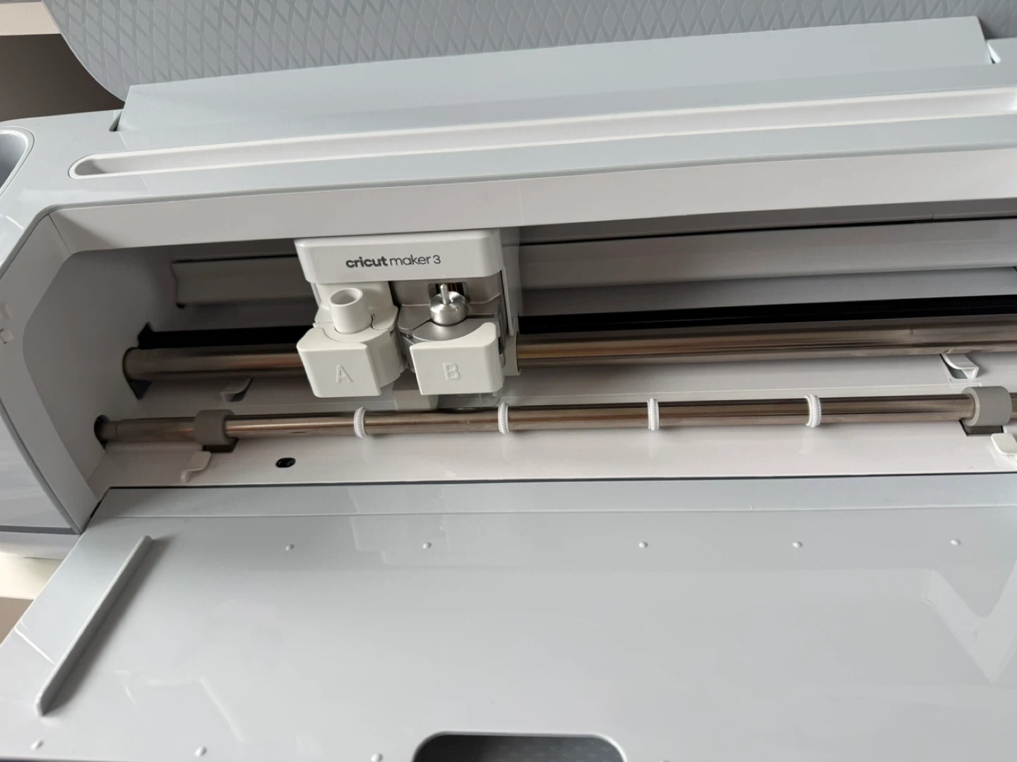 This is a Cricut Maker 3 cutting machine. It's white and silver with a sleek design. It comes with various cutting mats and printable sticker paper. Works with Cricut Smart Materials. USB cable and all supplies shown included. Will come in original box! It has only been used once to cut a square on cardstock.