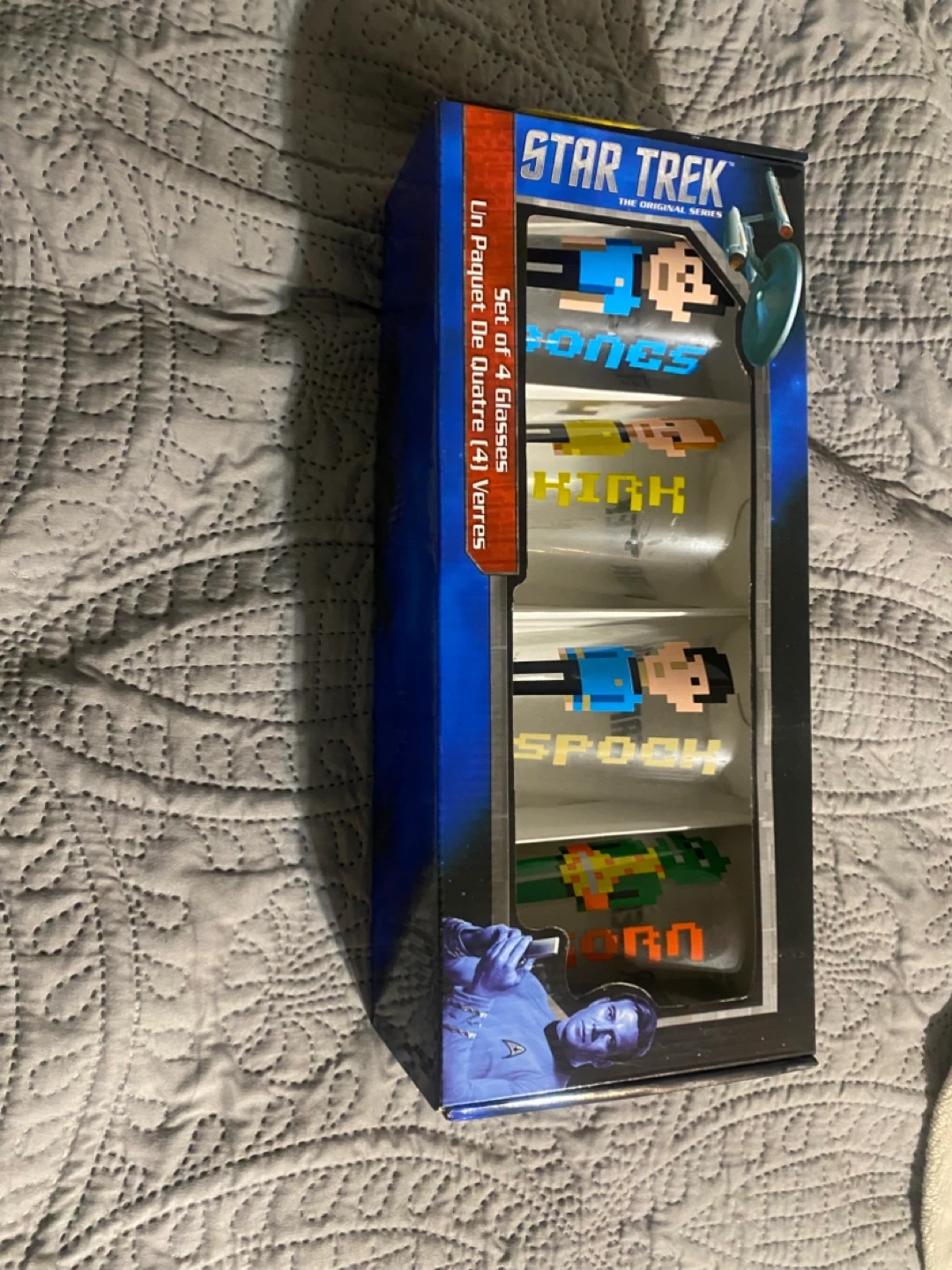 This is a set of four Star Trek: The Original Series glasses. They feature pixel art designs of characters like Spock and Kirk. The set comes in its original packaging. Never been used.