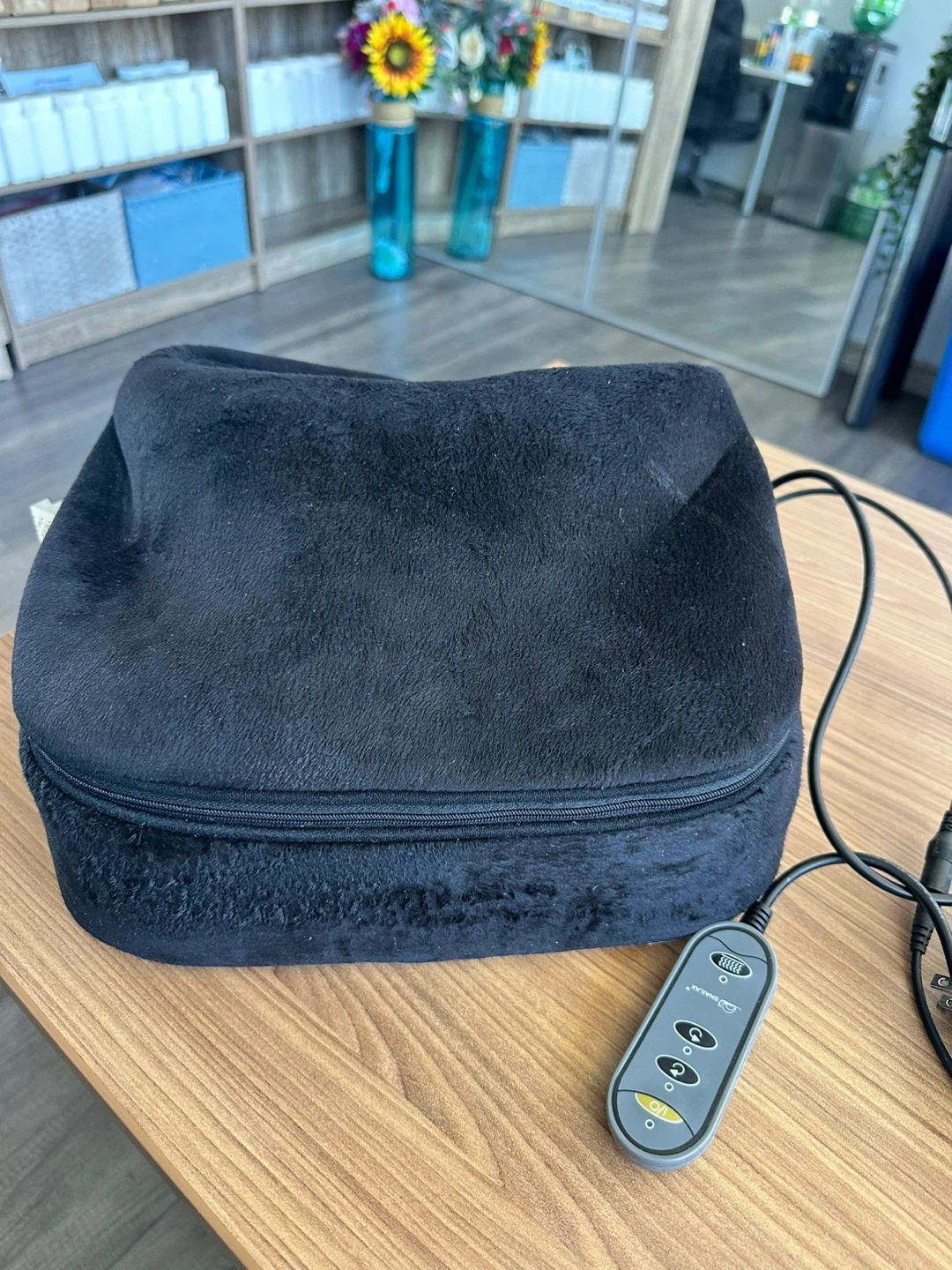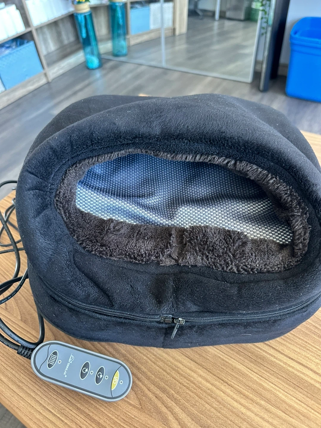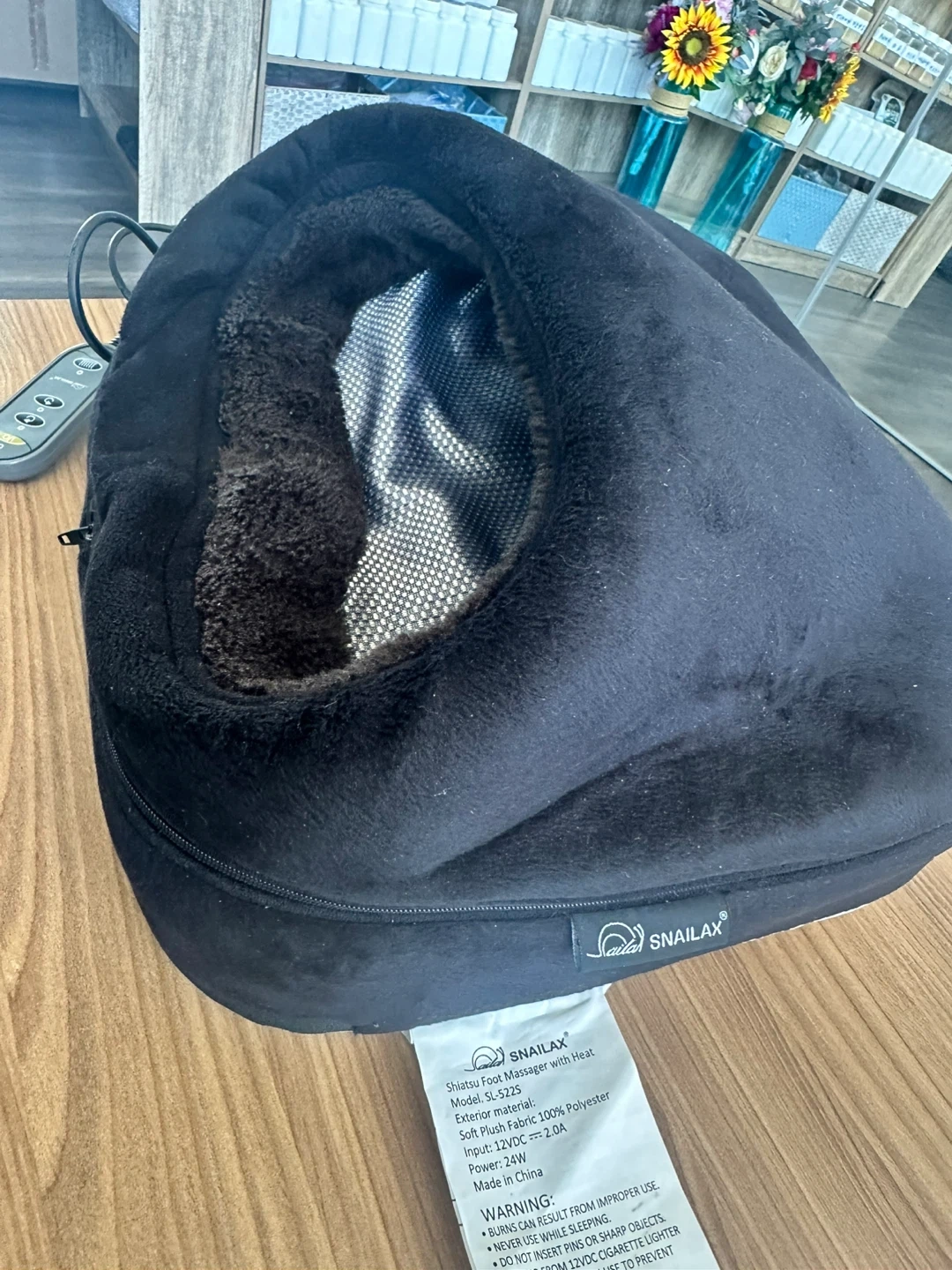 SNAILAX Shiatsu Foot Massager with Heat, model SL-5225. Exterior material is plush fabric (100% Polyester). Features multiple massage settings and heat function. Great for soothing tired feet after a long day!