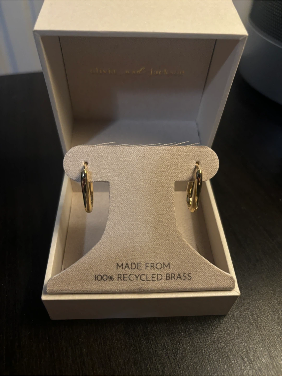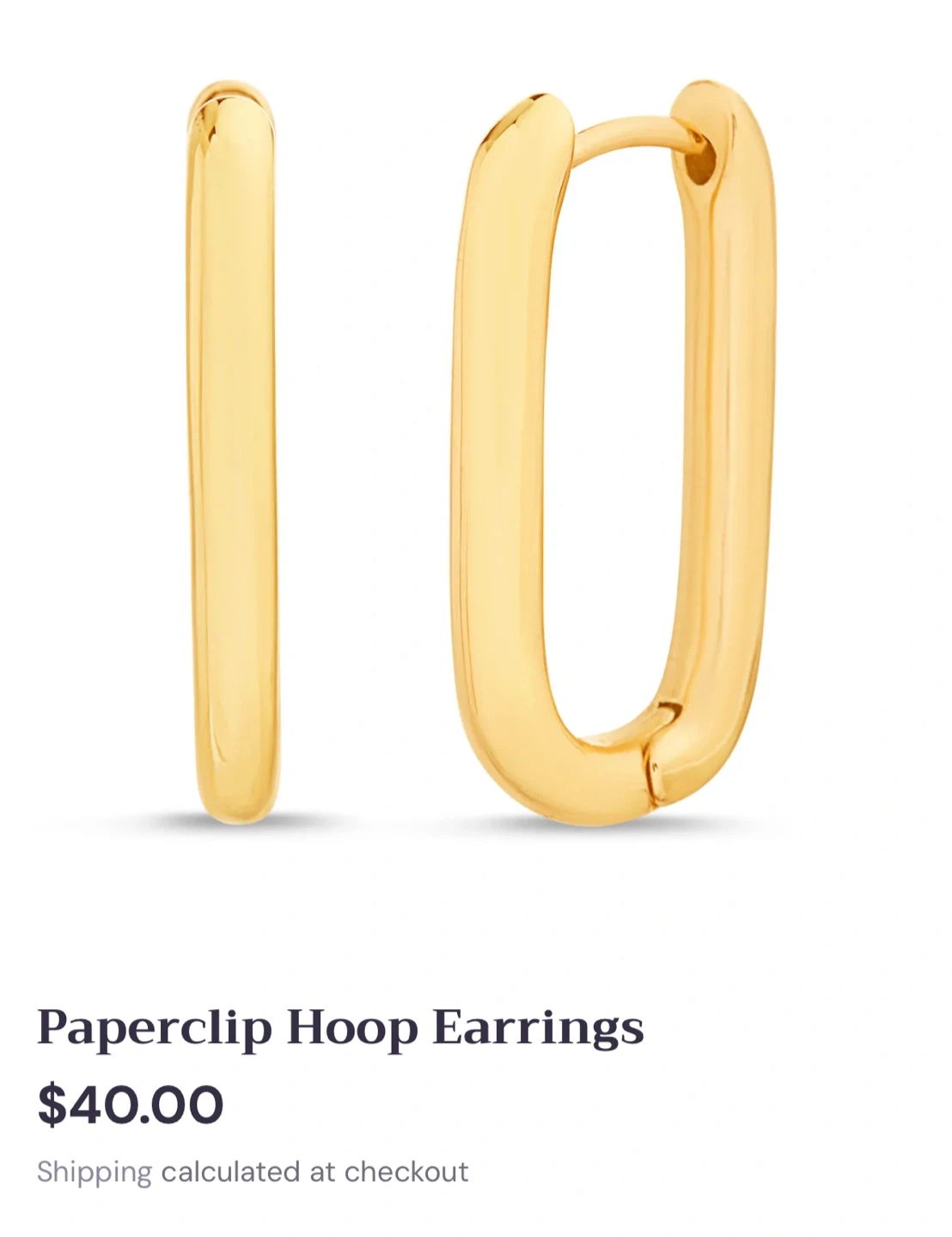 These gold-toned paperclip hoop earrings are made from 100% recycled brass. They're a stylish addition to any outfit!