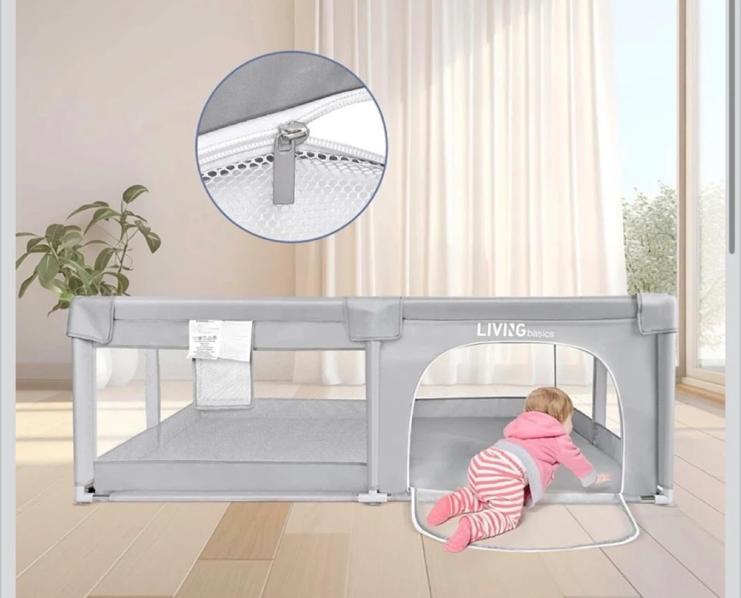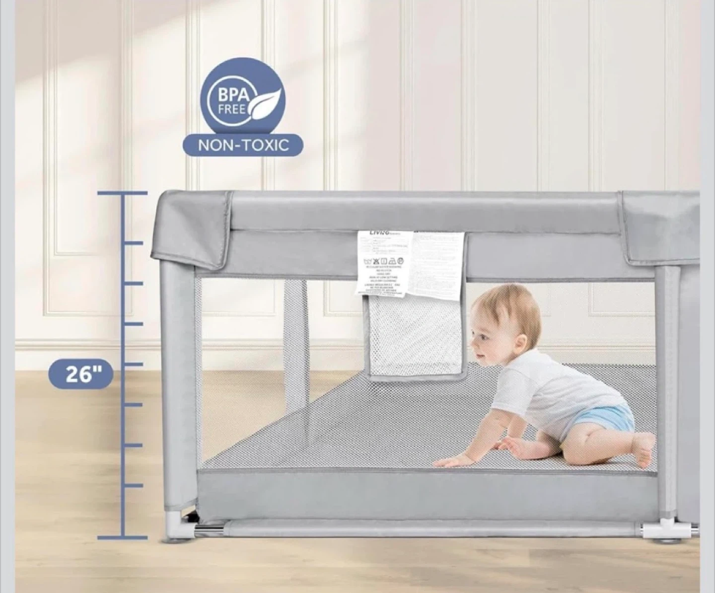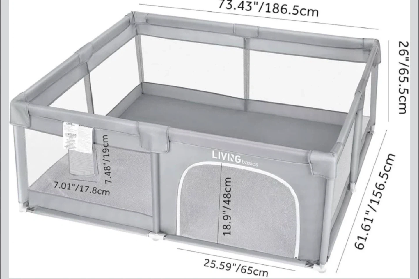 This grey playpen from LIVINGbasics provides a safe play area for little ones. It features a toy storage bag and pull rings to assist children when standing up. The dimensions are 73.43" x 61.61" x 26".