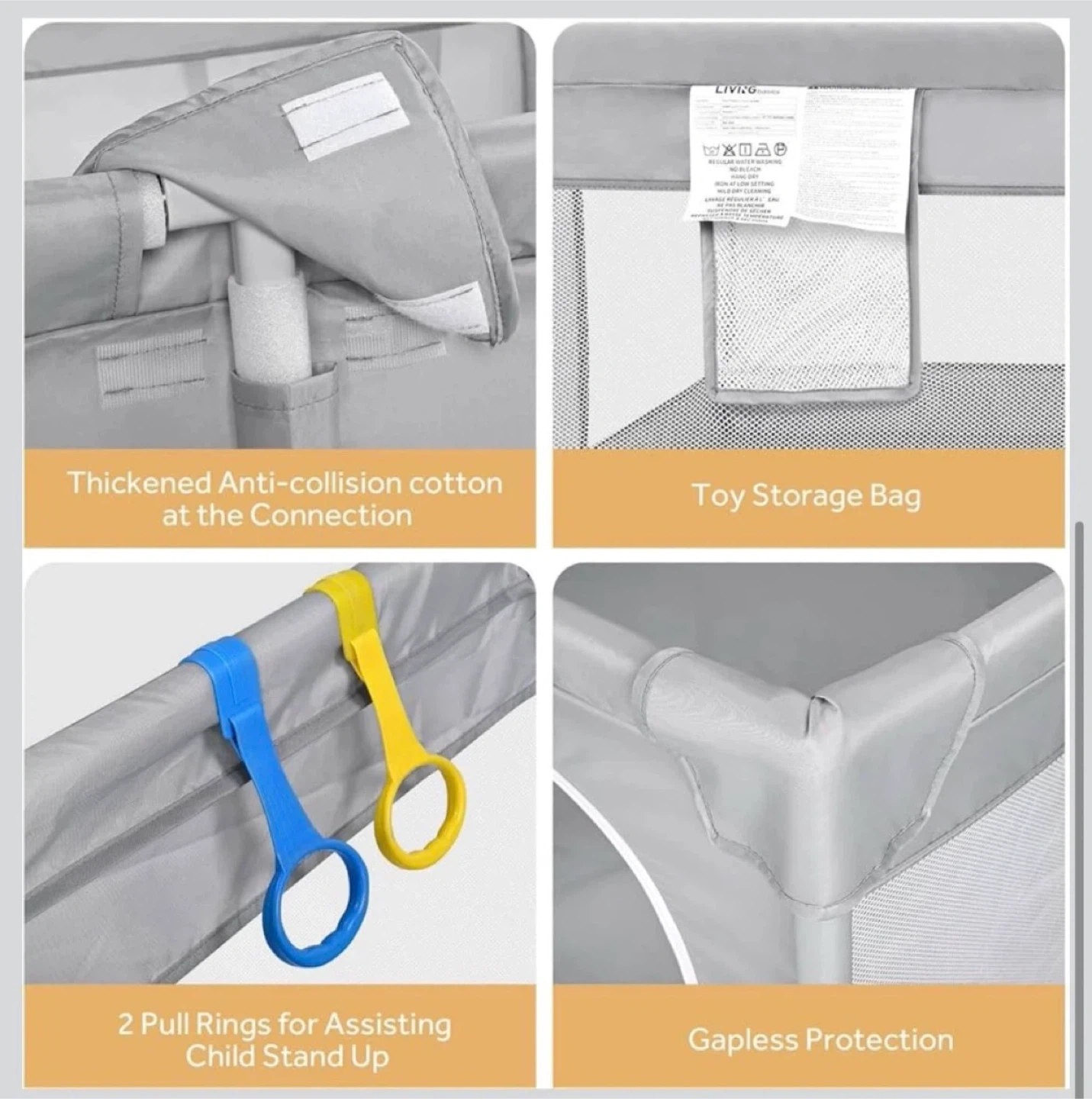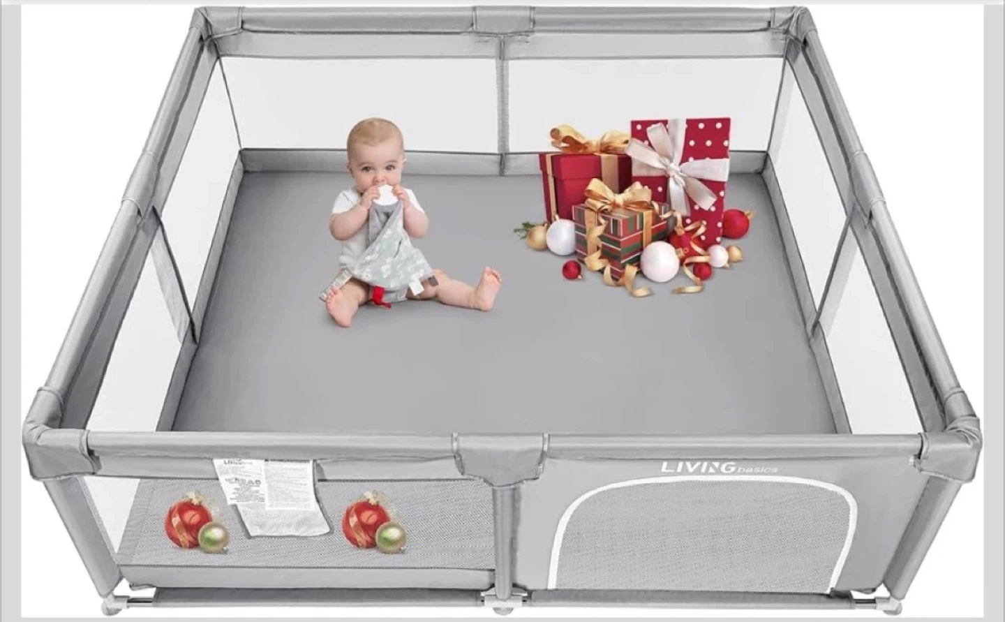This grey playpen from LIVINGbasics provides a safe play area for little ones. It features a toy storage bag and pull rings to assist children when standing up. The dimensions are 73.43" x 61.61" x 26".