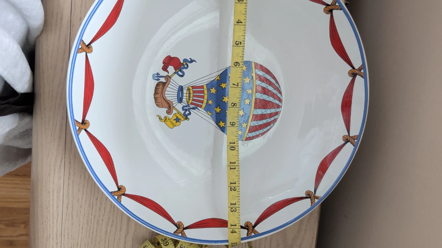 This Tiffany & Co. plate features a whimsical hot air balloon design with red ribbons and blue accents. It's ceramic and measures approximately 14 inches in diameter. Dishwasher safe.
