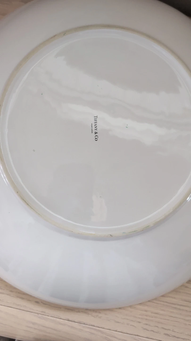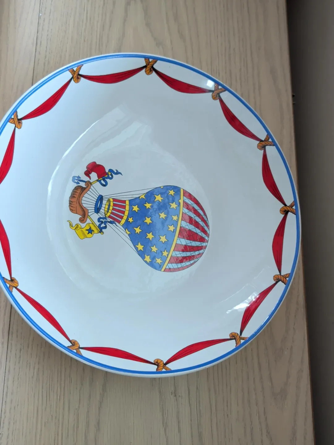 This Tiffany & Co. plate features a whimsical hot air balloon design with red ribbons and blue accents. It's ceramic and measures approximately 14 inches in diameter. Dishwasher safe.