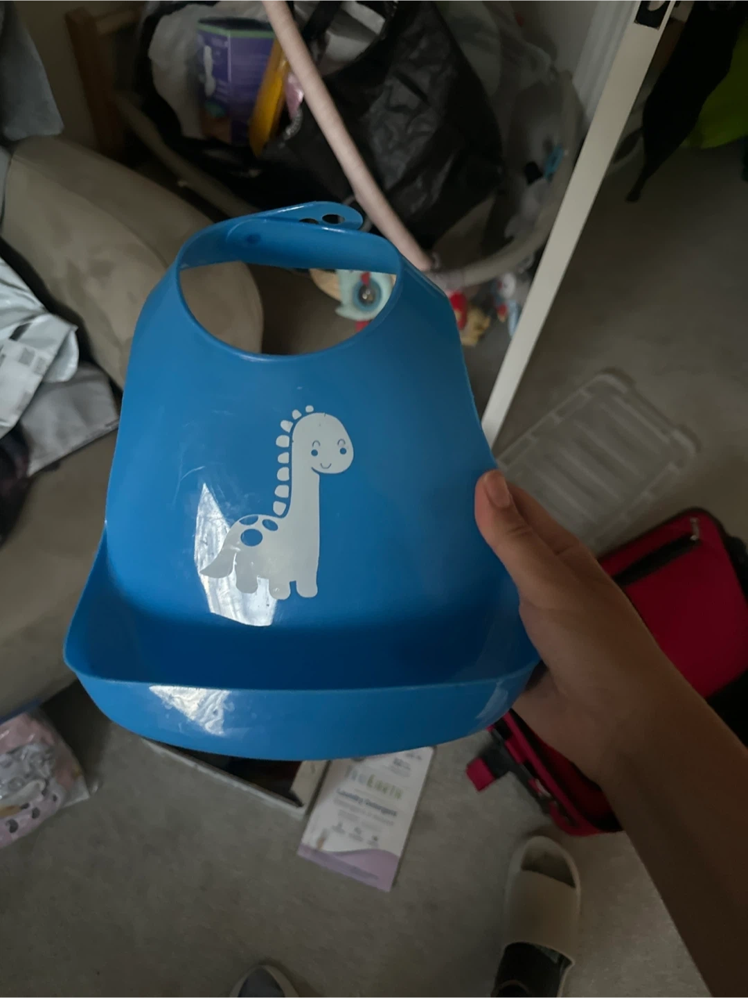This blue baby bib features a cute dinosaur graphic. It has a large catch pocket to help keep clothes clean during meals. Easy to wipe down.