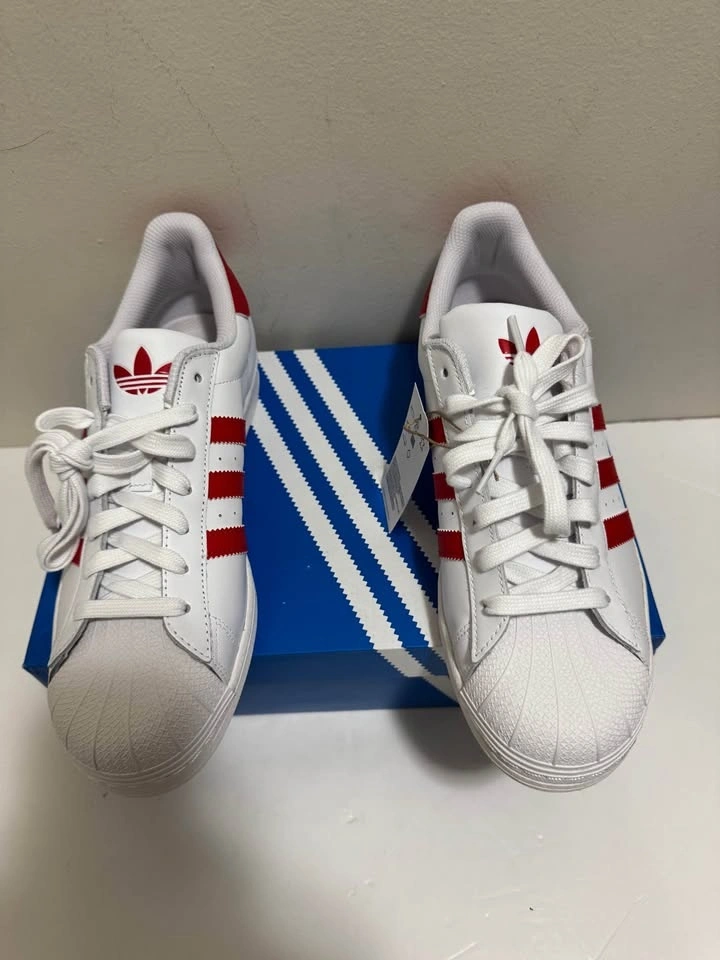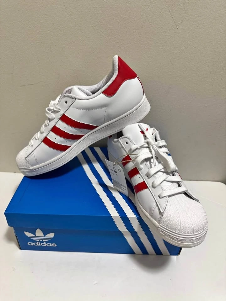 New Adidas Superstar sneakers. White with classic red stripes and heel tab. Still has the original tag on it. Comes with the blue Adidas box. Pick up only. Location: Close to Brampton Gateway Terminal and Shopper World Mall Brampton. Address will be provided when pick up time is scheduled and agreed. Cash only.