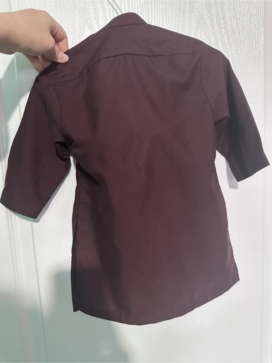 Boy's kurta pajama set in a deep red-brown colour/ Burgandy. Classic Nehru collar with button detailing. Comfortable elastic waistband on the pants. Suitable for festive occasions or everyday wear. Very comfortable material.