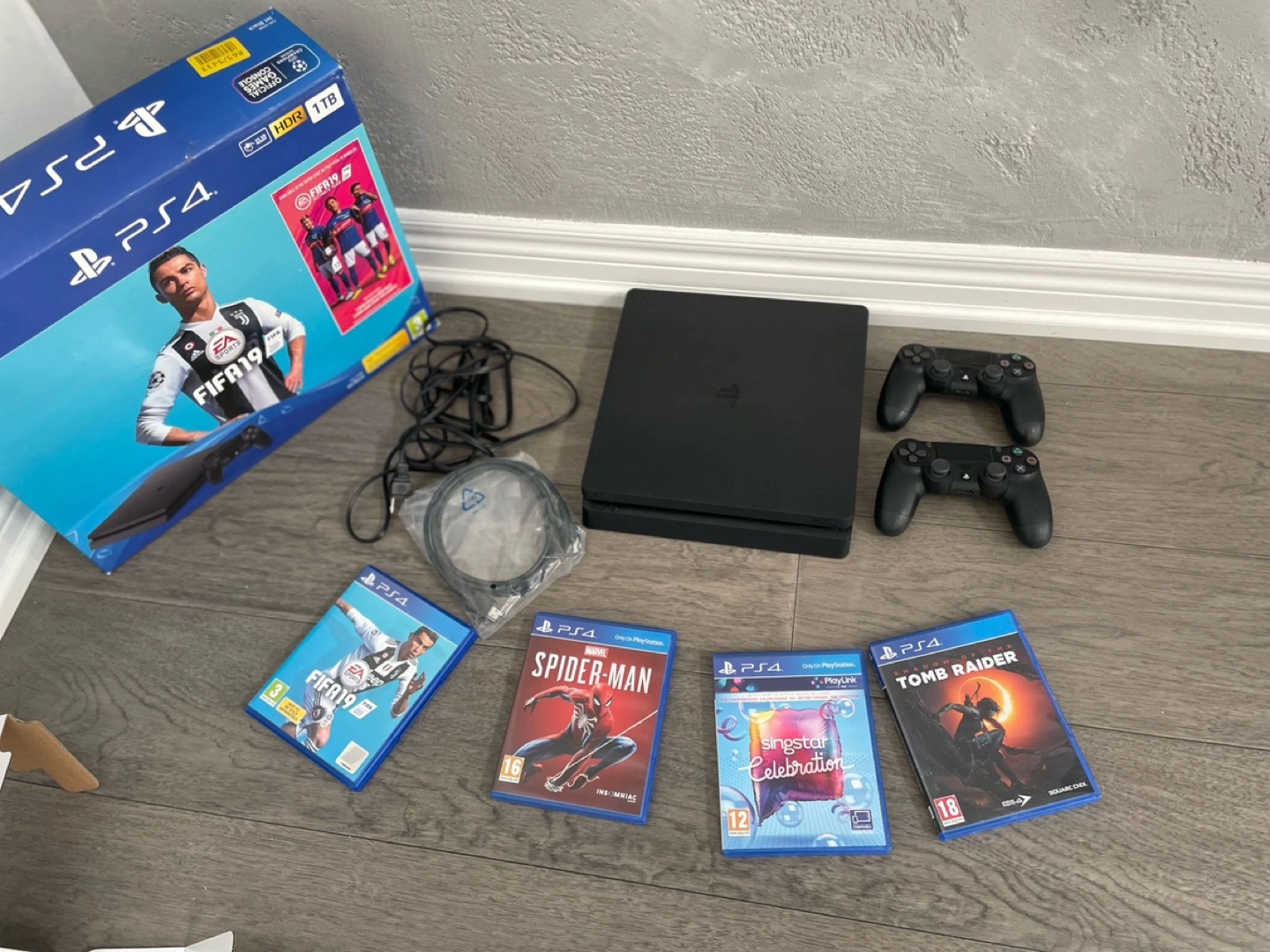PlayStation 4 1TB console, two controllers, power cable, and HDMI cable included. Four games: FIFA 19, Marvel's Spider-Man, SingStar Celebration, and Tomb Raider. Perfect condition.