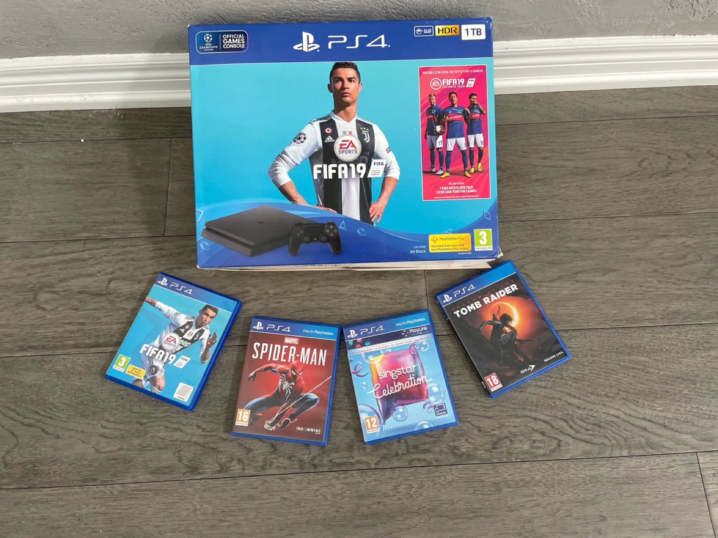 PlayStation 4 1TB console, two controllers, power cable, and HDMI cable included. Four games: FIFA 19, Marvel's Spider-Man, SingStar Celebration, and Tomb Raider. Perfect condition.