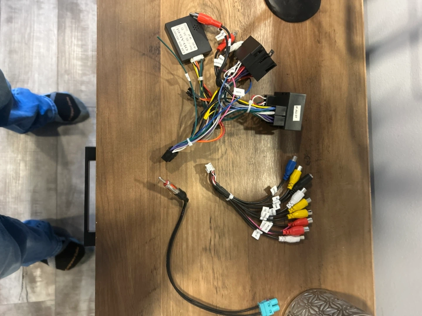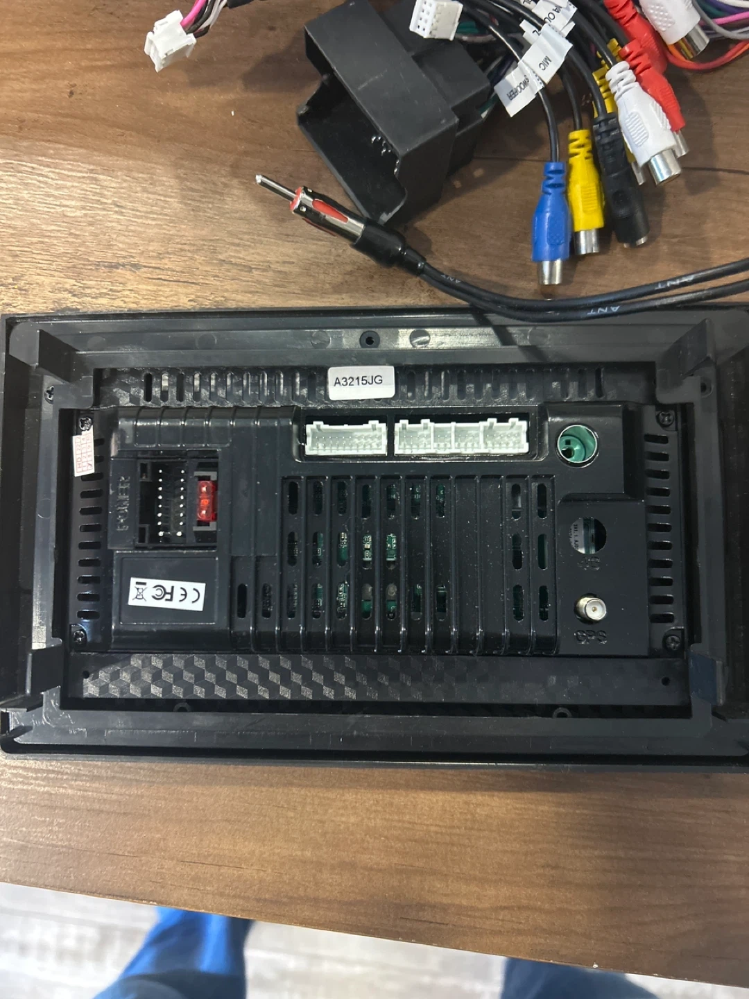 This is a car stereo head unit, complete with all necessary wiring. It's designed for easy installation and use. Includes a variety of RCA cables for audio and video connections.