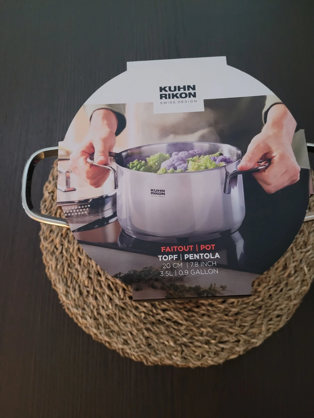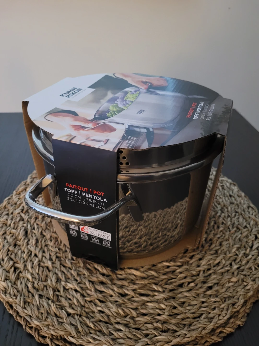 This is a new Kuhn Rikon Faitout pot. It's 20 cm (7.8 inches) in diameter and holds 3.5 litres (0.9 gallons). It's made of stainless steel with strong handles.