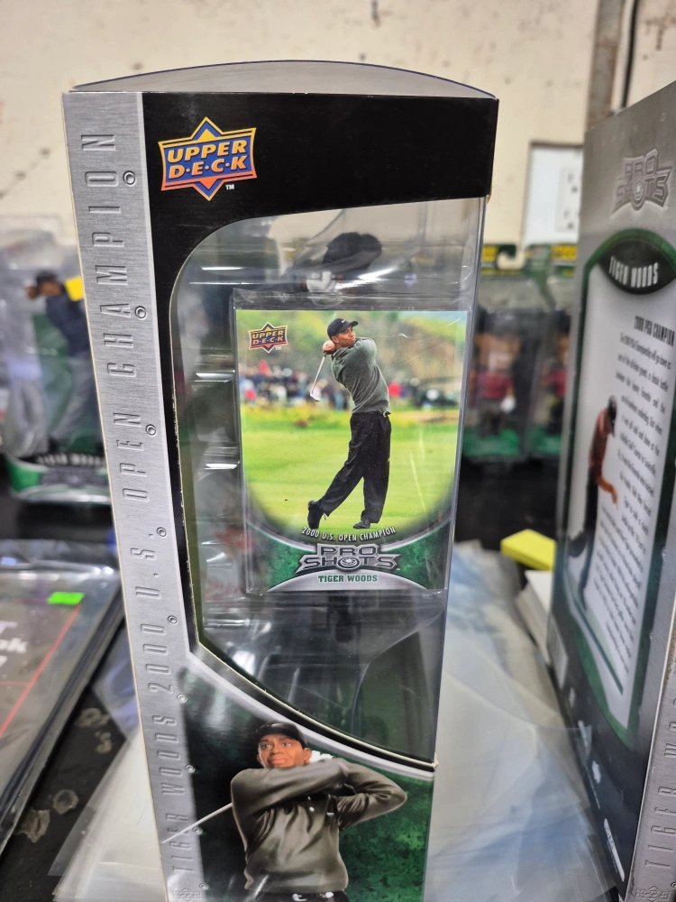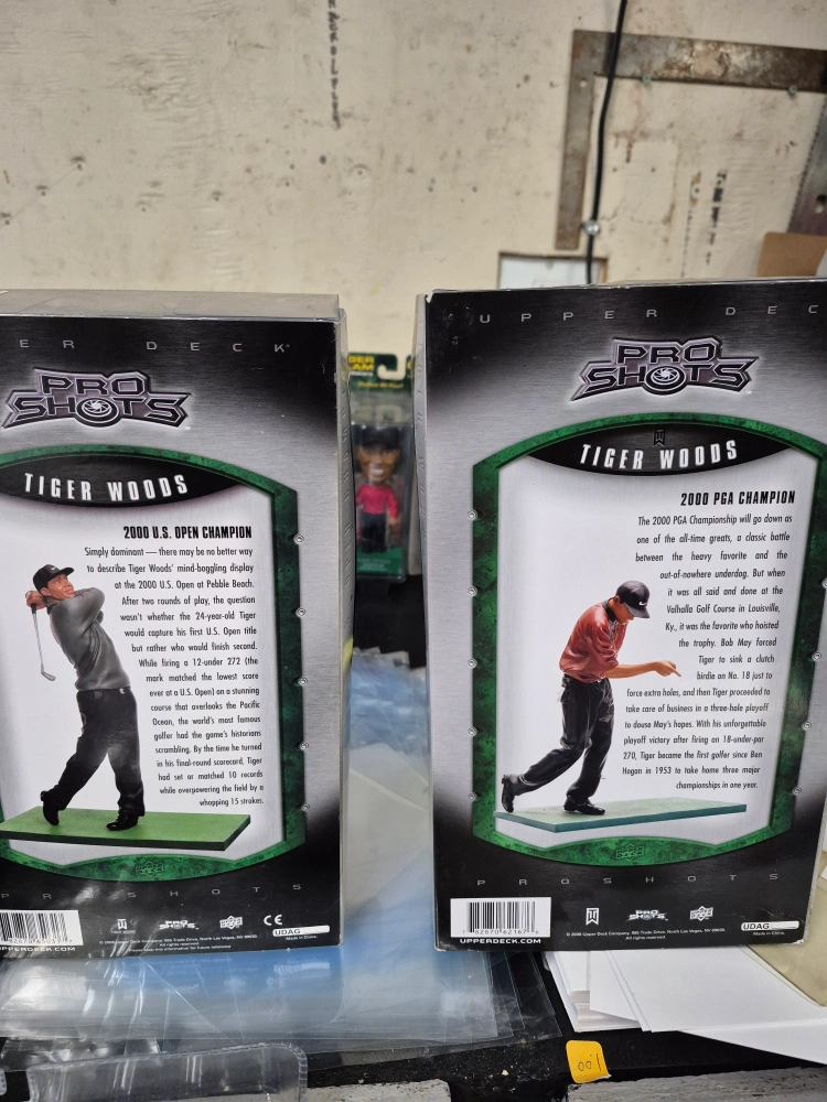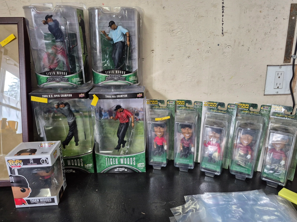 Collection of Tiger Woods memorabilia. Includes framed photos, several figurines, bobbleheads, and a Funko Pop! figure. Upper Deck Pro Shots and Pro Set brands are visible on some items. Great for collectors or fans.