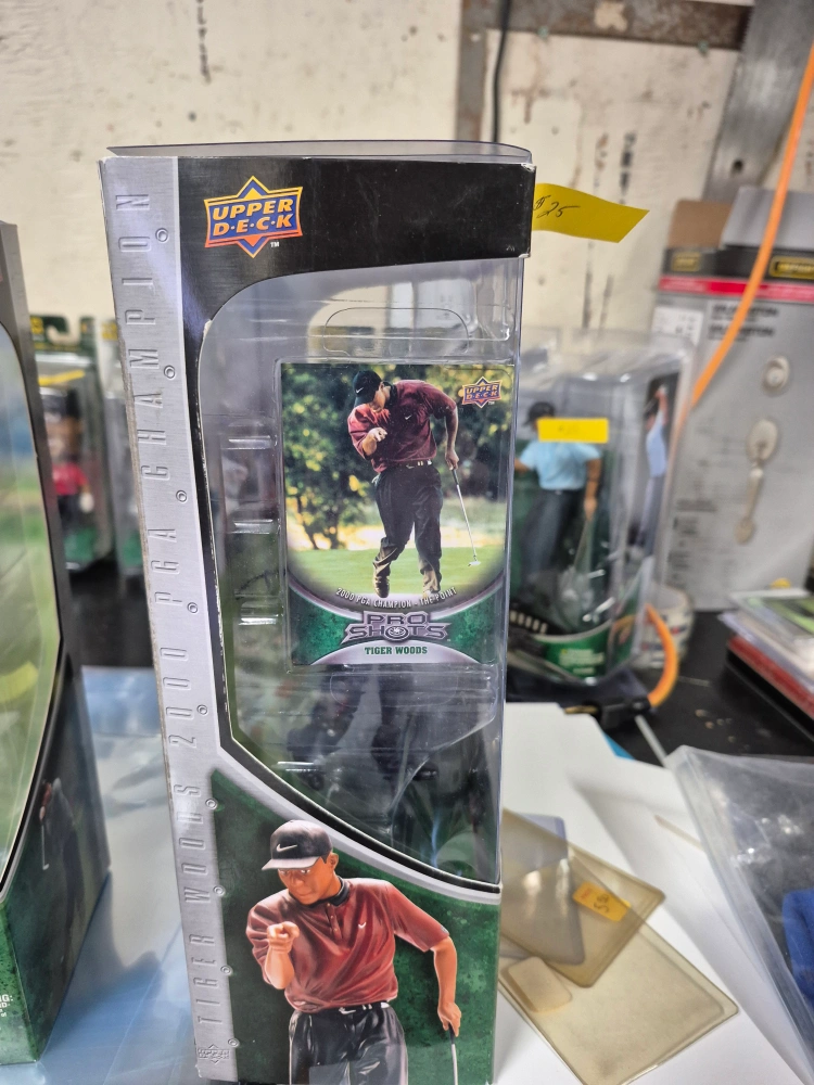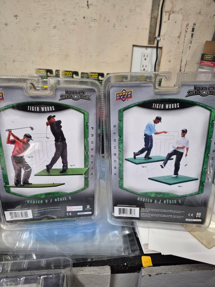 Collection of Tiger Woods memorabilia. Includes framed photos, several figurines, bobbleheads, and a Funko Pop! figure. Upper Deck Pro Shots and Pro Set brands are visible on some items. Great for collectors or fans.